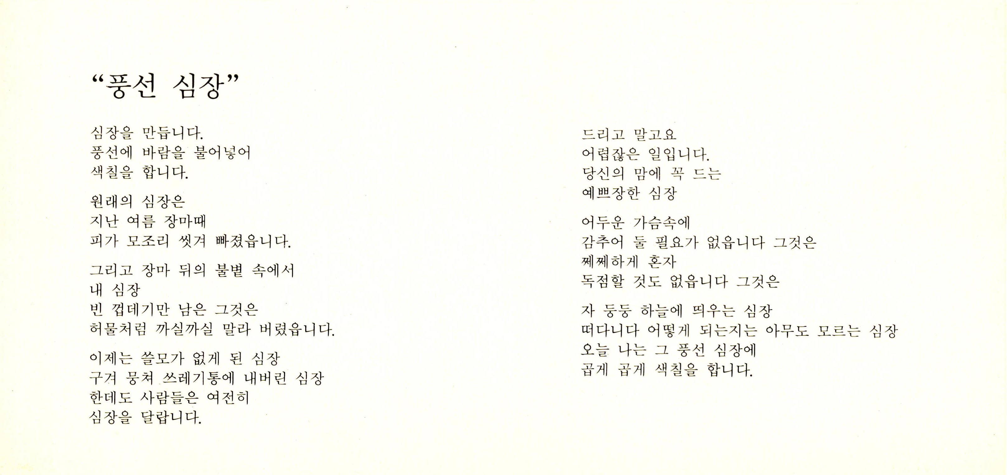 원래의 심장이 장마때 피가 씻기고 불볕에 껍데기만 남아 말라 버려 쓸모없게 된 심장을 사람들이 달라고 아우성을 치고 그래서 새풍선에 바람을 넣고 색을 칠해 새로운 심장을 만든다.