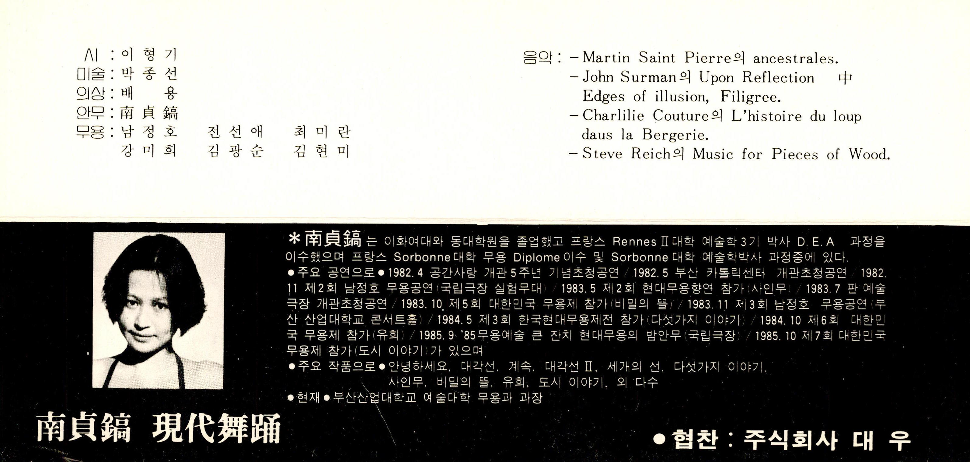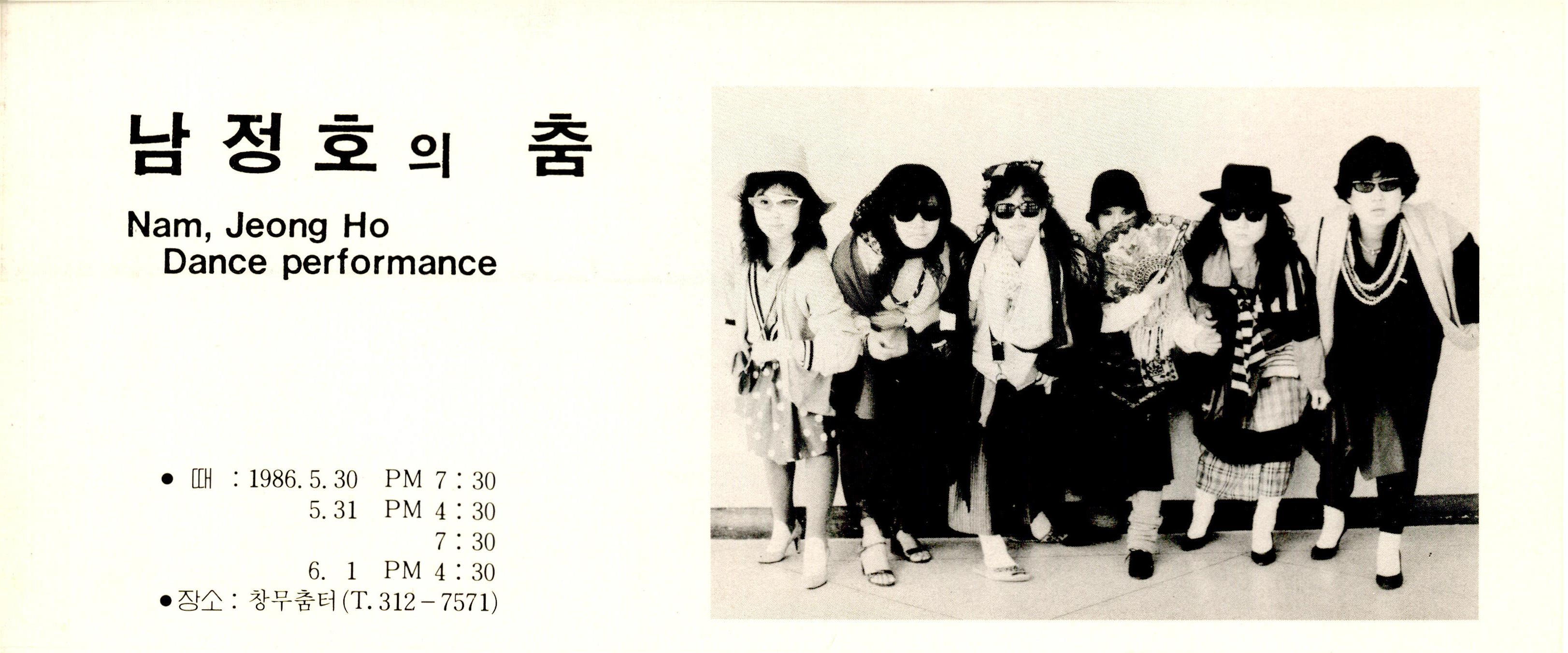 1986년 5월 30일 부터 6월 1일까지 창무춤터에서 공연된 《창무 큰춤판 "남정호의 춤"南貞鎬(남정호) 現代舞踊(현대무용)》리플렛이다. 남정호의 연혁이 사진과 함께 기술되어 있고, 주식회사 대우의 협찬으로 공연되었다. 이형기의 "풍선 심장" 시가 발췌되어 있는데, 내용으로는 원래의 심장이 장마때 피가 씻기고 불볕에 껍데기만 남아 말라 버려 쓸모없게 된 심장을 사람들은 달라고 아우성을 치고 그래서 새풍선에 바람을 넣고 색을 칠해 새로운 심장을 만든다는 내용이 기술되어 있다. 그리고 STAFF의 명단이 나열되어 있고, 뒷면에는 무용전용 소극장 창무춤터에서 그동안의 공연에 대한 내용과 이번공연을 기획하게 된 의의등이 기술되어 있고, 차기 공연안내 기술과 출연진의 사진을 끝으로 리플렛 구성이 끝난다.