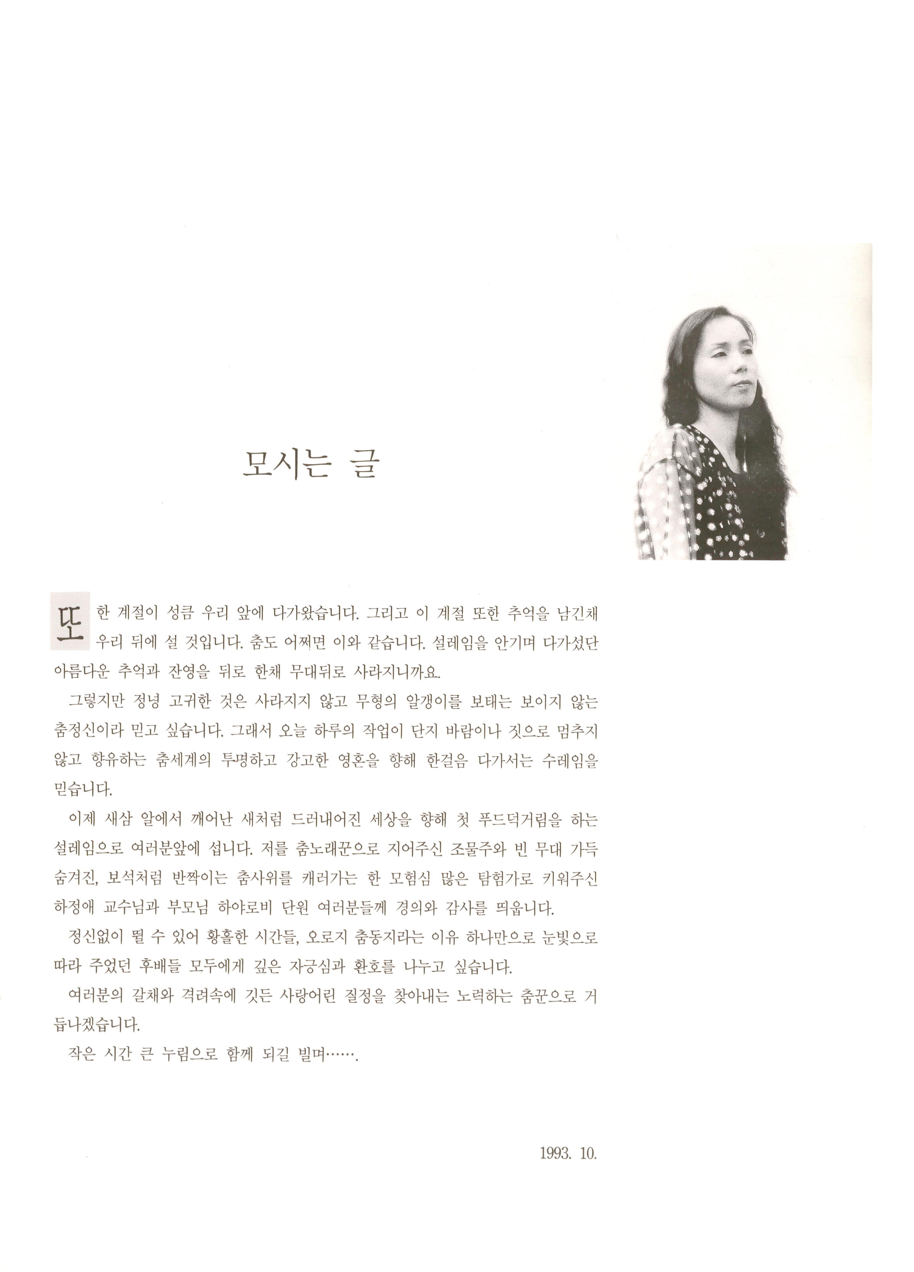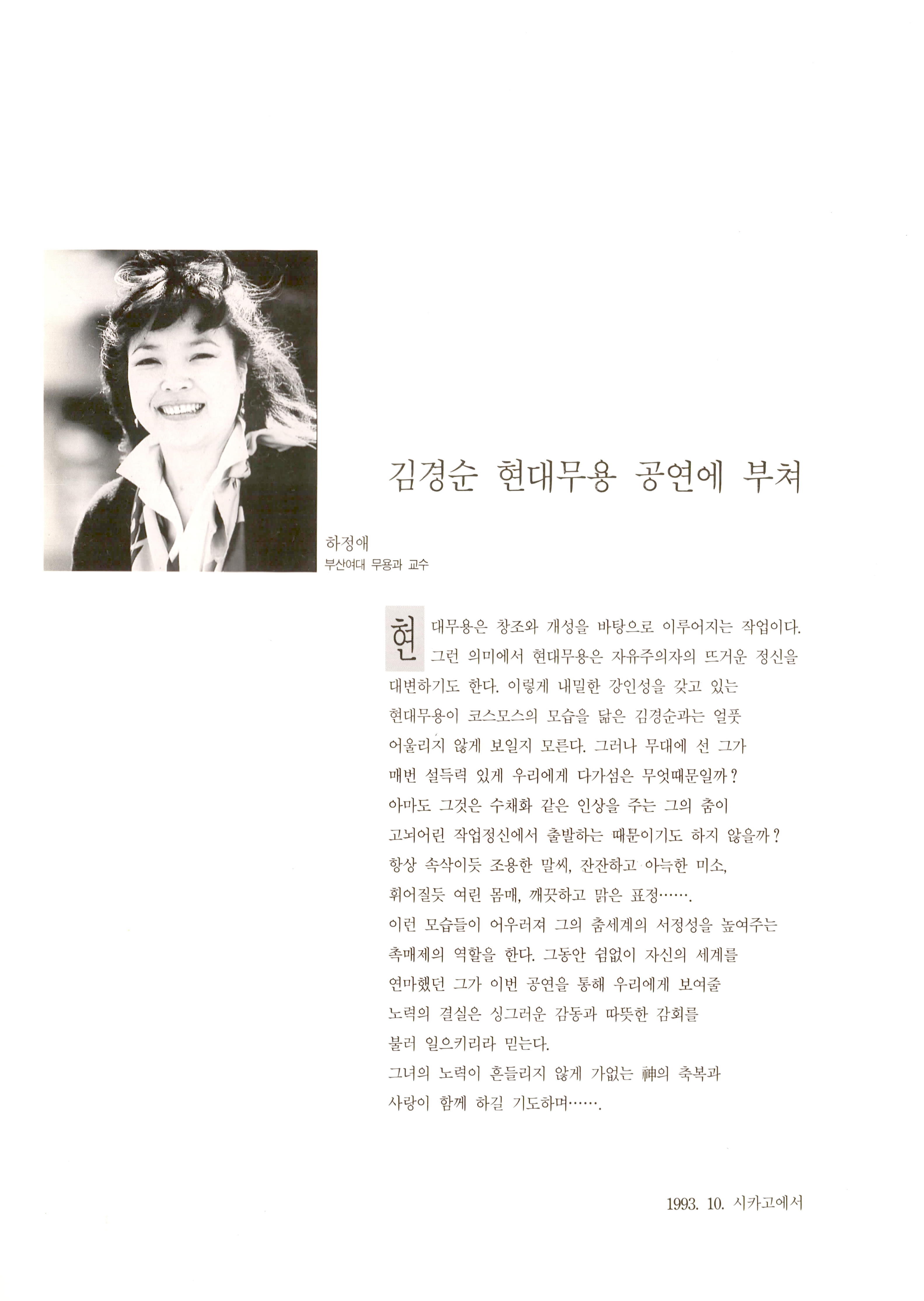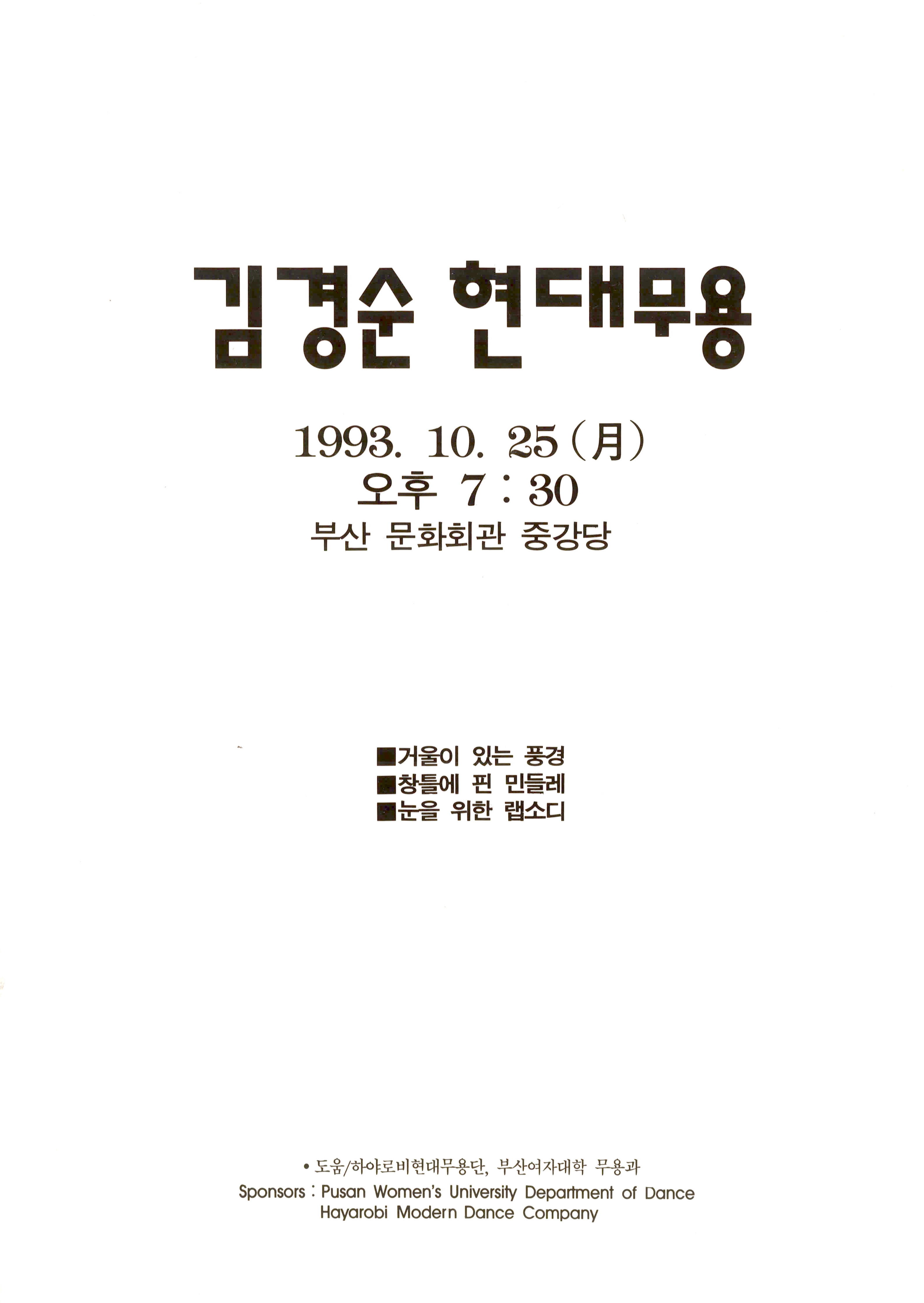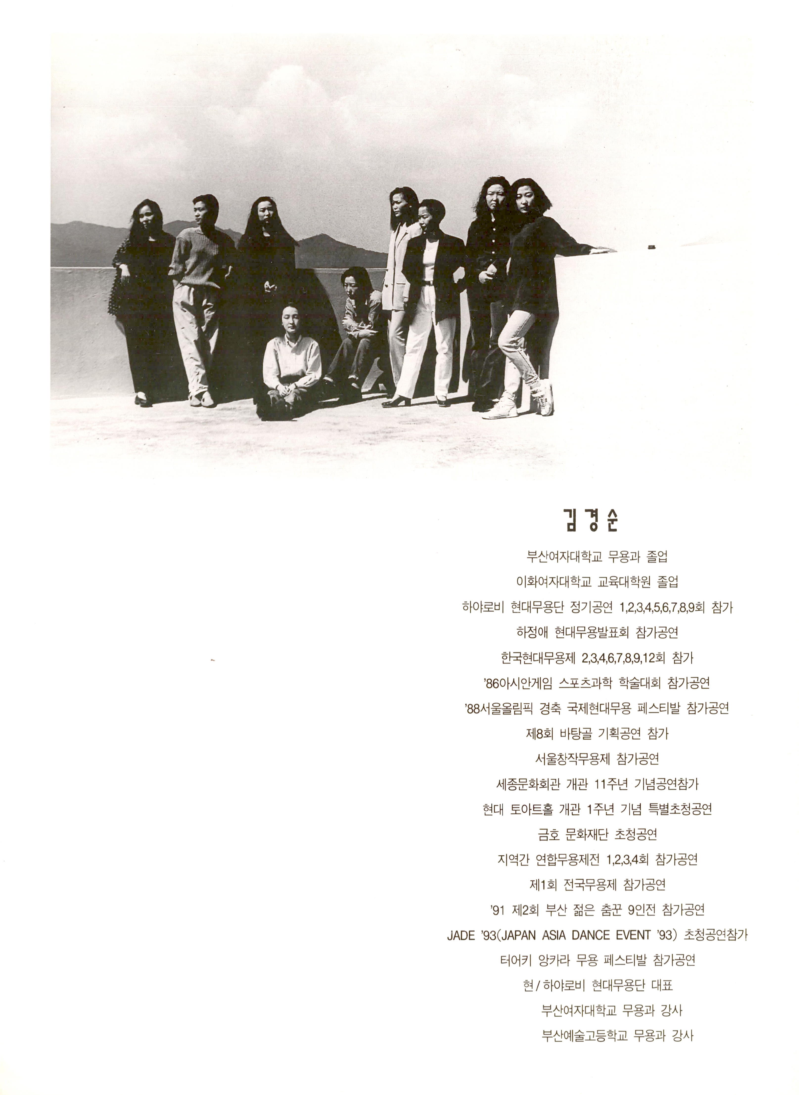 1993년 10월 25일 부산문화회관 중강당에서 공연된 《김경순 (김경순 현대무용)》의 프로그램북이다. STAFF명단이 나열되어 있고 하야로비현대무용단과 부산여자대학무용과의 도움으로 제작되었다고 기술되어있다. 부산여대무용과 교수 하정애의 '김경순 현대무용 공연에 부쳐'글과 '모시는글'이 기술되어 있다. 총3편의 프로그램이 공연되었는데 공연순서에 따라 작품소개글이 기술되어 있고, 김경순의 연혁이 기재되어 있으며, 출연진의 사진 및 명단과 나열되어 프로그램북 구성이 끝난다.