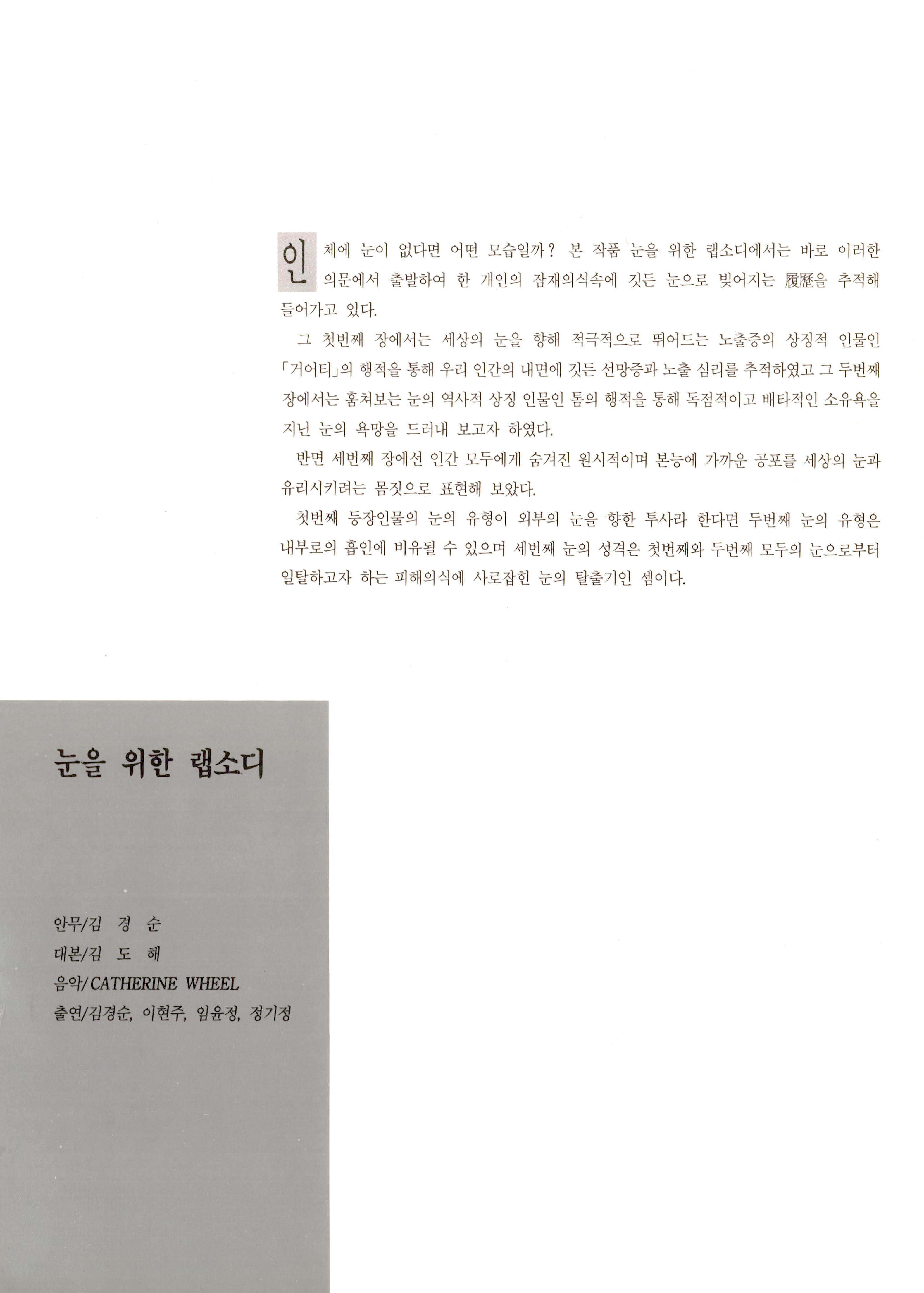 인체에 눈이 없다면 어떤 모습일까? 이러한 의문에서 출발하여 한 개인의 잠재의식속에 깃든 눈으로 빚어지는 이력을 추적해 들어가는 내용을 담고 있다.