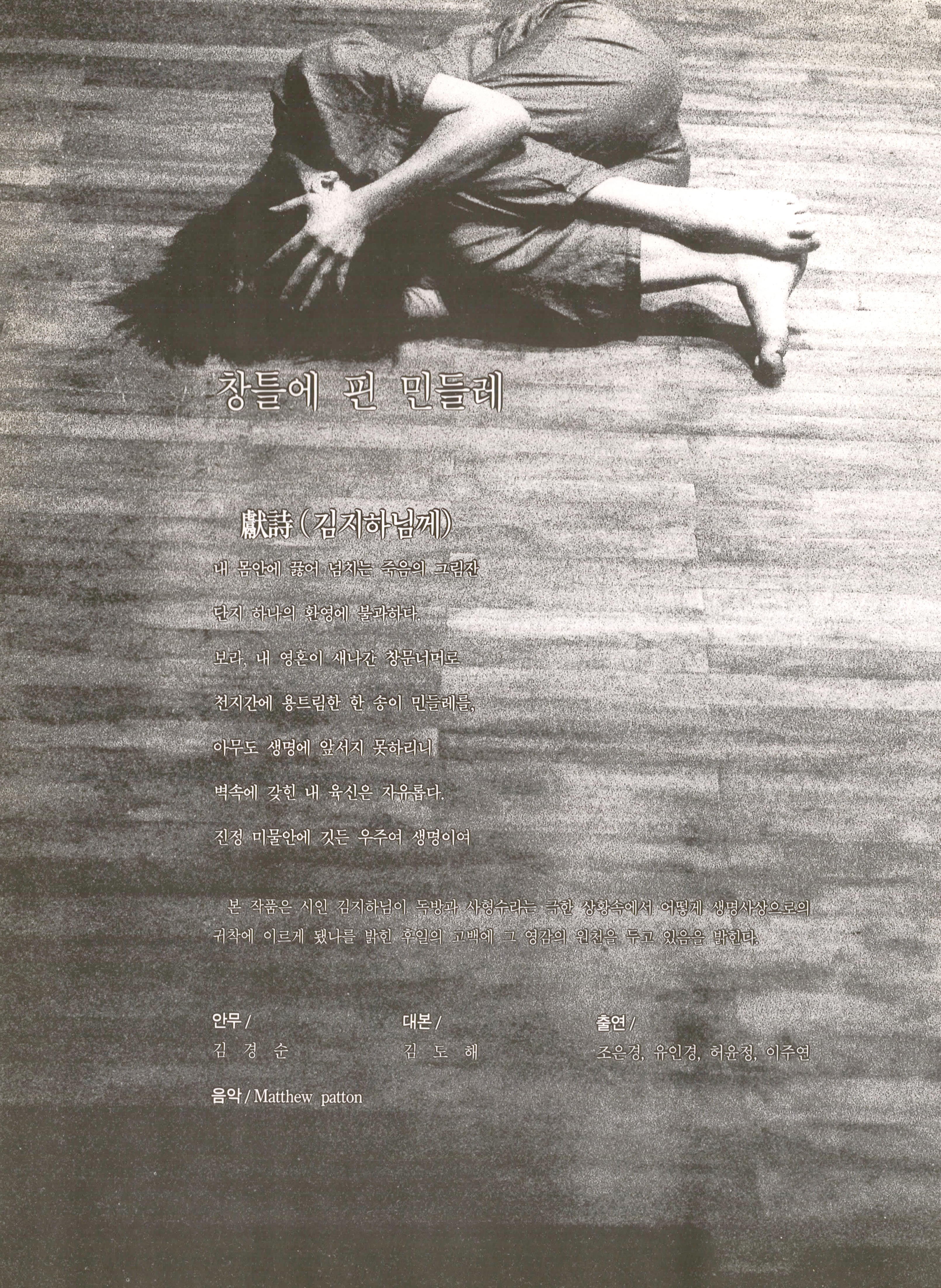 시인 김지하 님이 독방과 사형수라는 극한 상황 속에서 어떻게 생명사상으로서의 귀착에 이르게 됐나를 밝힌 후일의 고백에 그 영감의 원천을 두었고 내 몸 안에 끓어 넘치는 죽음의 그림자는 하나의 환영이고 내 영혼이 새어나간 창문 너머로 한 송이 민들레를 진정 미물 안에 깃든 우주이고 생명이다 라는 내용을 담고 있다.
