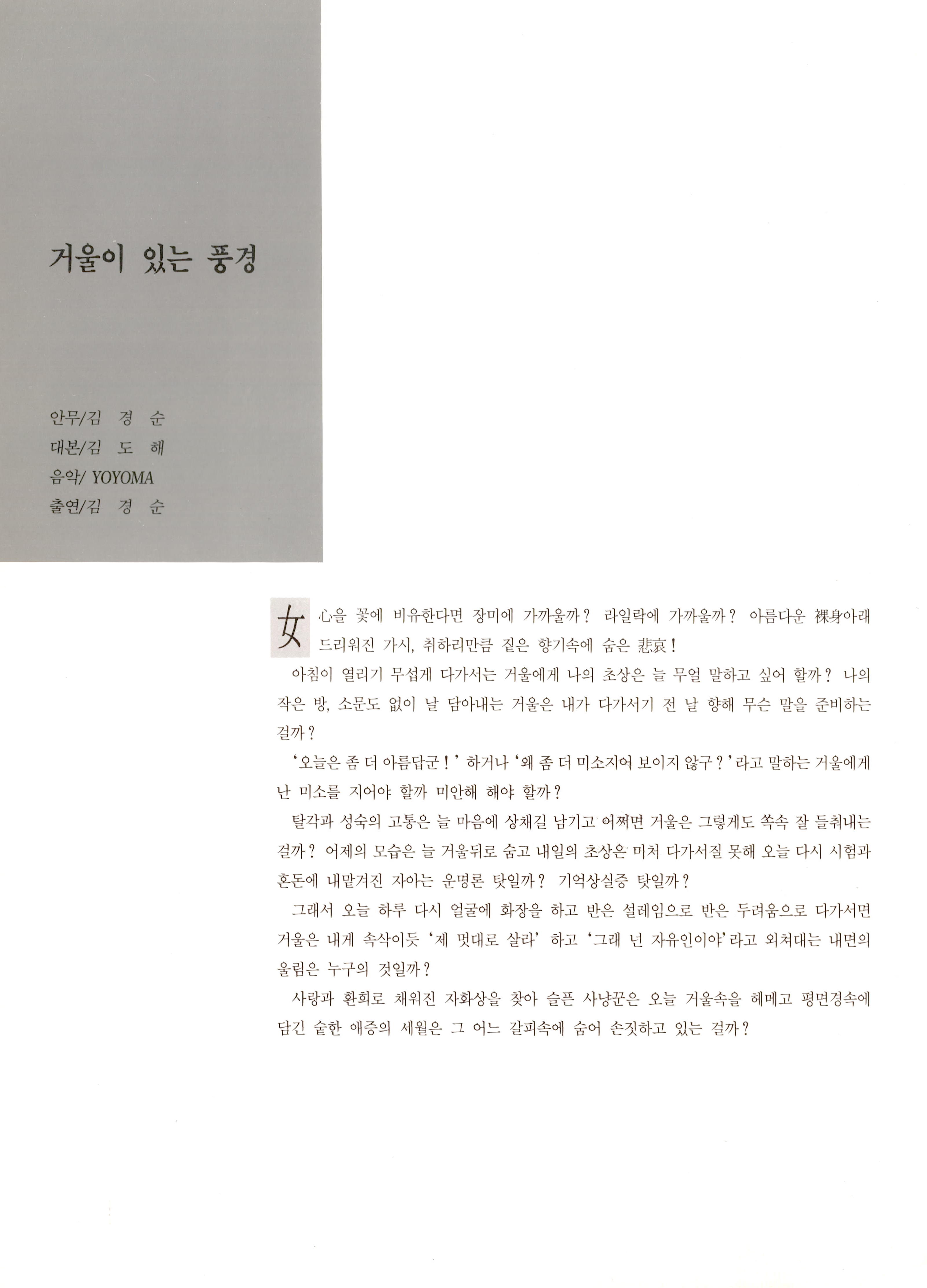 탈각과 성숙의 고통은 늘 마음에 상채길 남기고 어제의 모습은 늘 거울 뒤로 숨고 내일의 초상은 미처 다가서질 못해 오늘 다시 시험과 혼돈에 내맡겨진 자아는 다시 얼굴에 화장을 하고 반은 설레임으로 반은 두려움으로 다가서면 거울은 내게 속삭이듯 "제멋대로 살라"하고 "그래 넌 자유인이야"라고 외쳐 대는 내면의 울림은 누구의 것인가 라는 내용을 담고 있다.