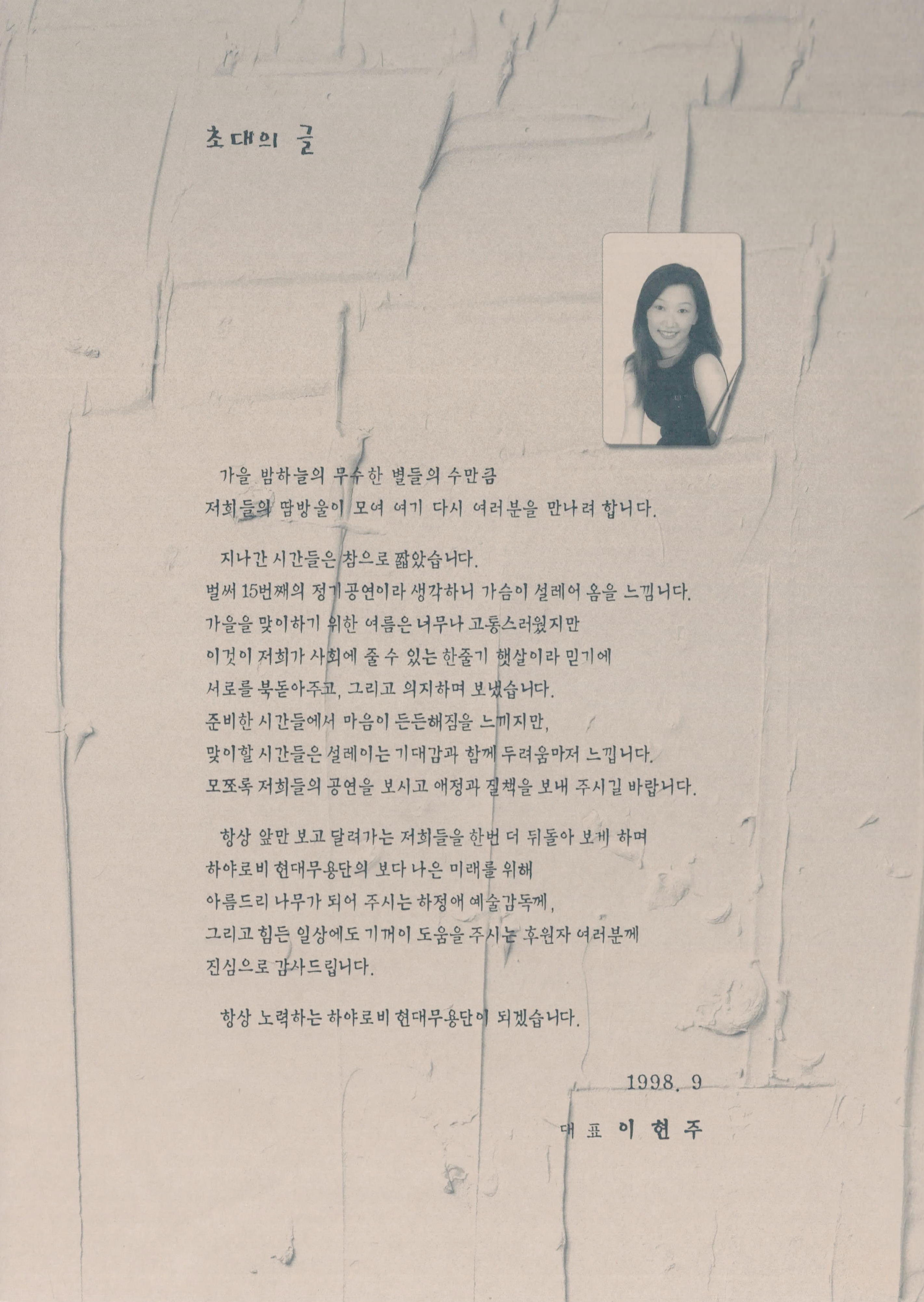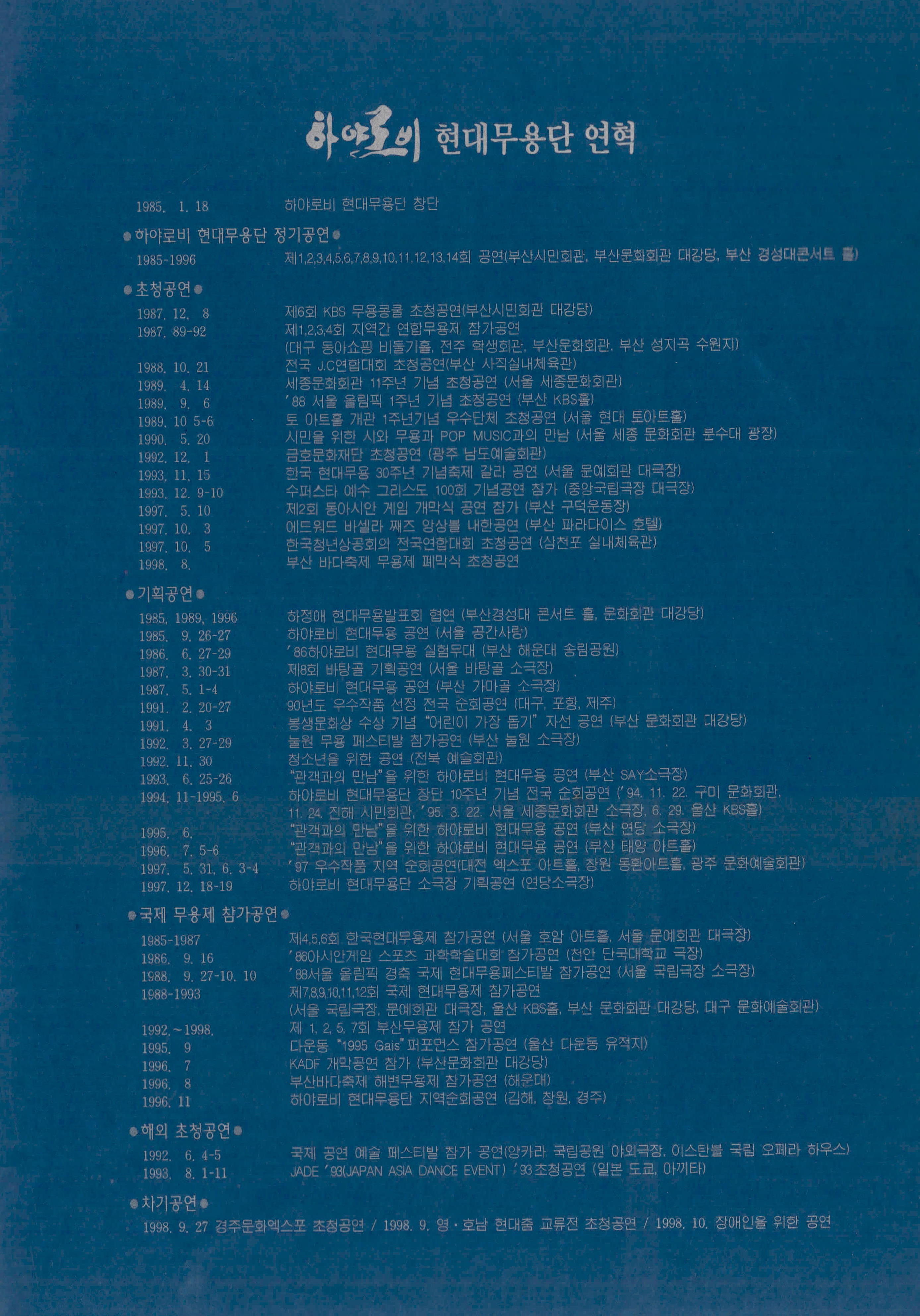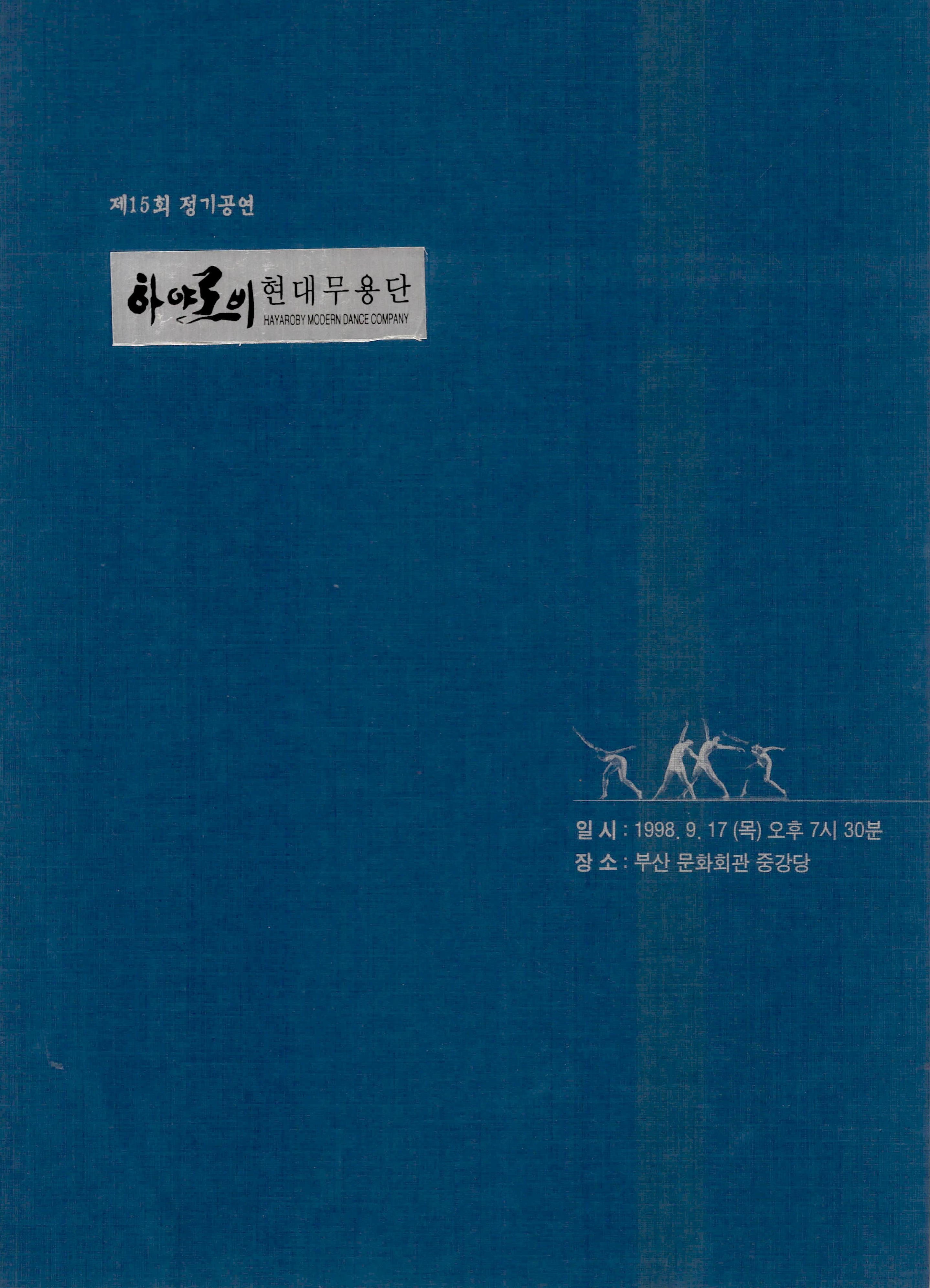 (팜플렛) 1998년 9월 17일 부산 문화회관 중강당에서 열린 《제15회 정기공연 하야로비 현대무용단》팜플렛이다. 하야로비 현대무용단 대표 이현주의 초대글, '가을에 그린 나의 그림', '시든 장미를 다시 꽂으며', '거미강(綱) 거미목(目)'으로 구성된 작품 내용을 포함하고 있으며, 출연자의 사진과 명단, 하야로비 현대무용단 후원회, 하야로비 현대무용단 남·녀 정단원 및 기획단원 모집 오디션 공고, 하야로비 현대무용단 연혁이 기술되어 있다.
