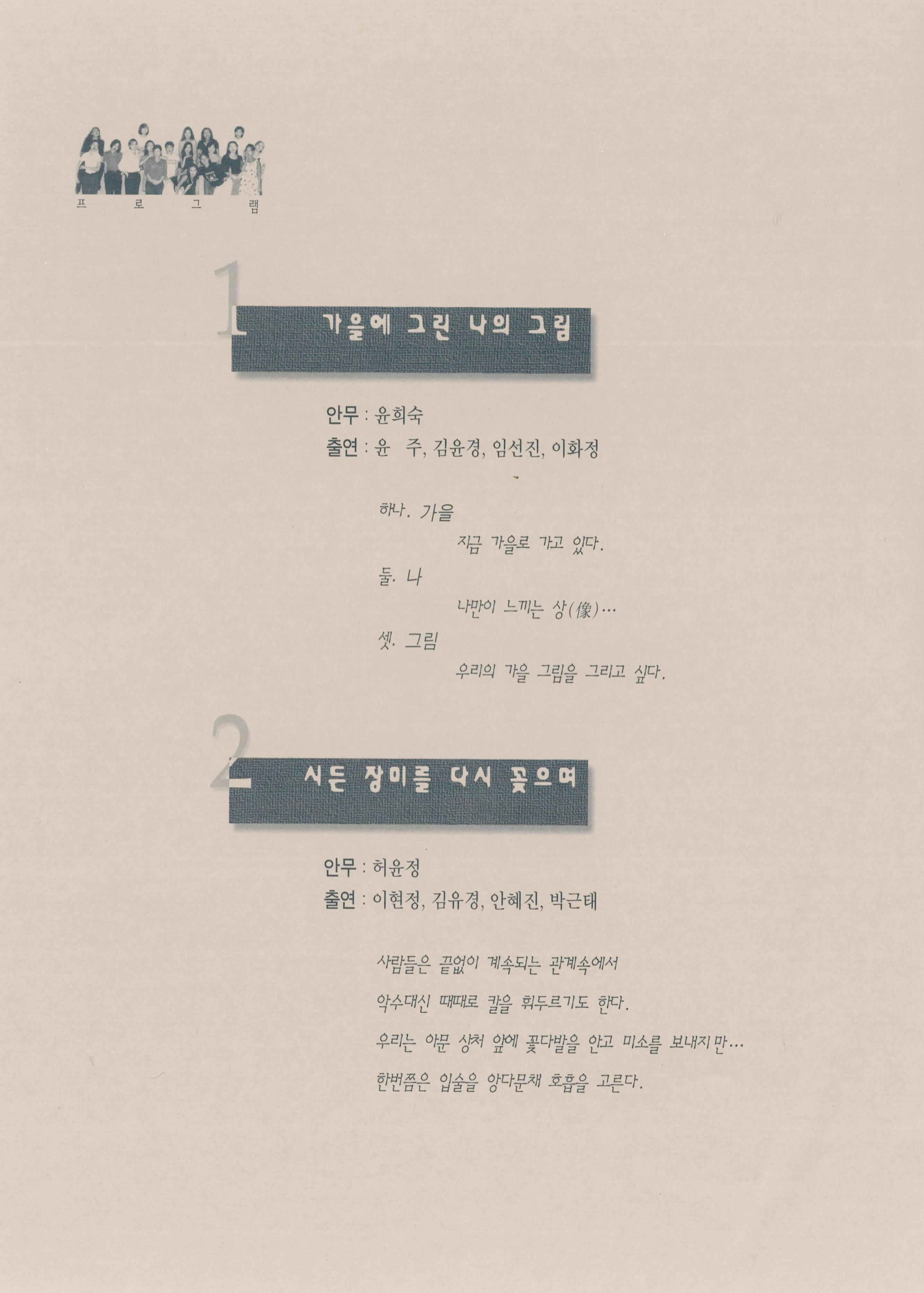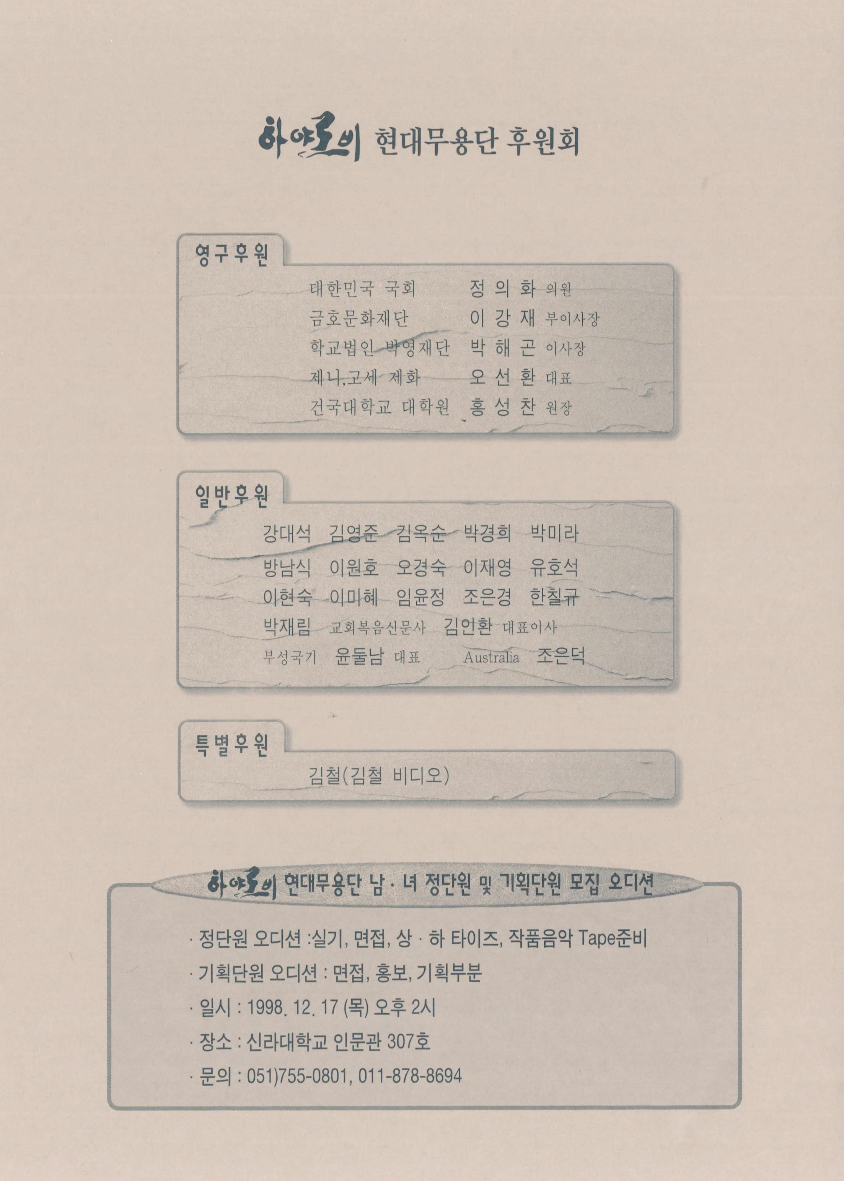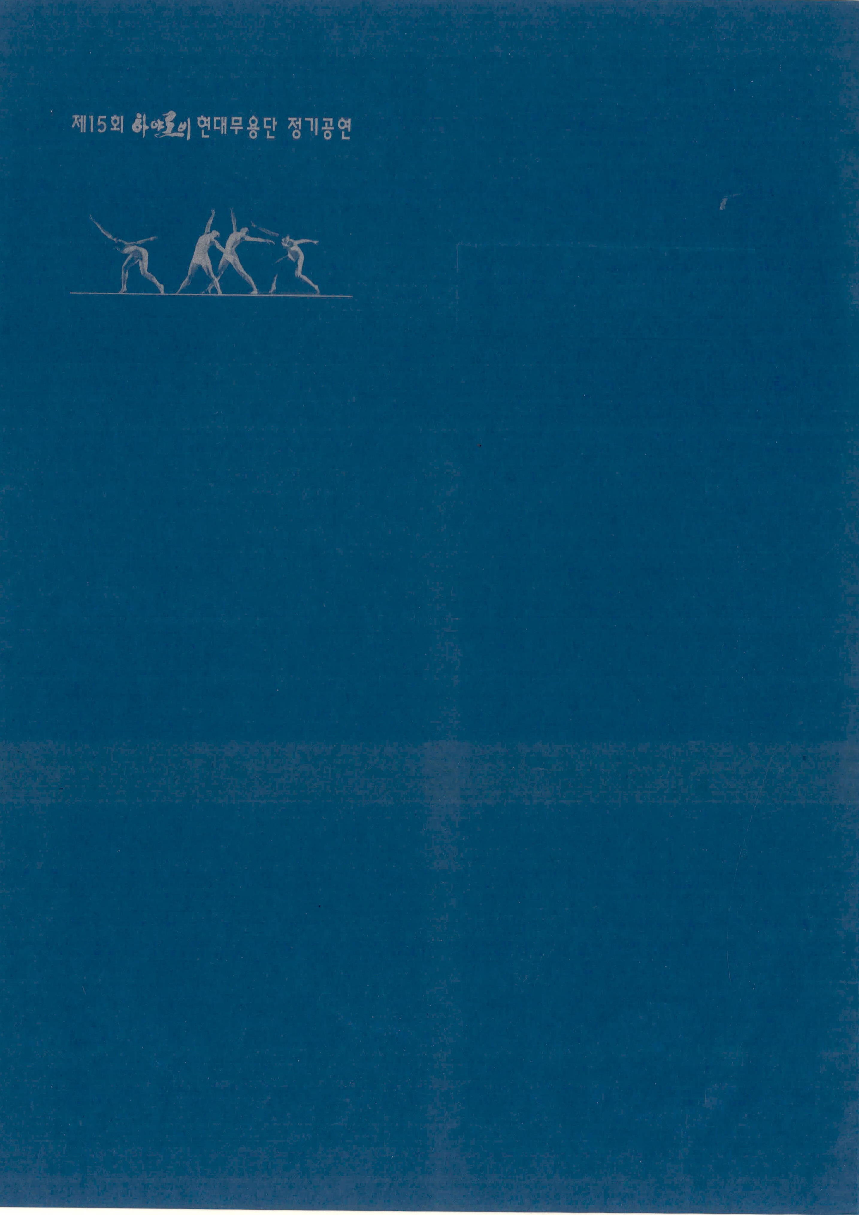 (팜플렛) 1998년 9월 17일 부산 문화회관 중강당에서 열린 《제15회 정기공연 하야로비 현대무용단》팜플렛이다. 하야로비 현대무용단 대표 이현주의 초대글, '가을에 그린 나의 그림', '시든 장미를 다시 꽂으며', '거미강(綱) 거미목(目)'으로 구성된 작품 내용을 포함하고 있으며, 출연자의 사진과 명단, 하야로비 현대무용단 후원회, 하야로비 현대무용단 남·녀 정단원 및 기획단원 모집 오디션 공고, 하야로비 현대무용단 연혁이 기술되어 있다.