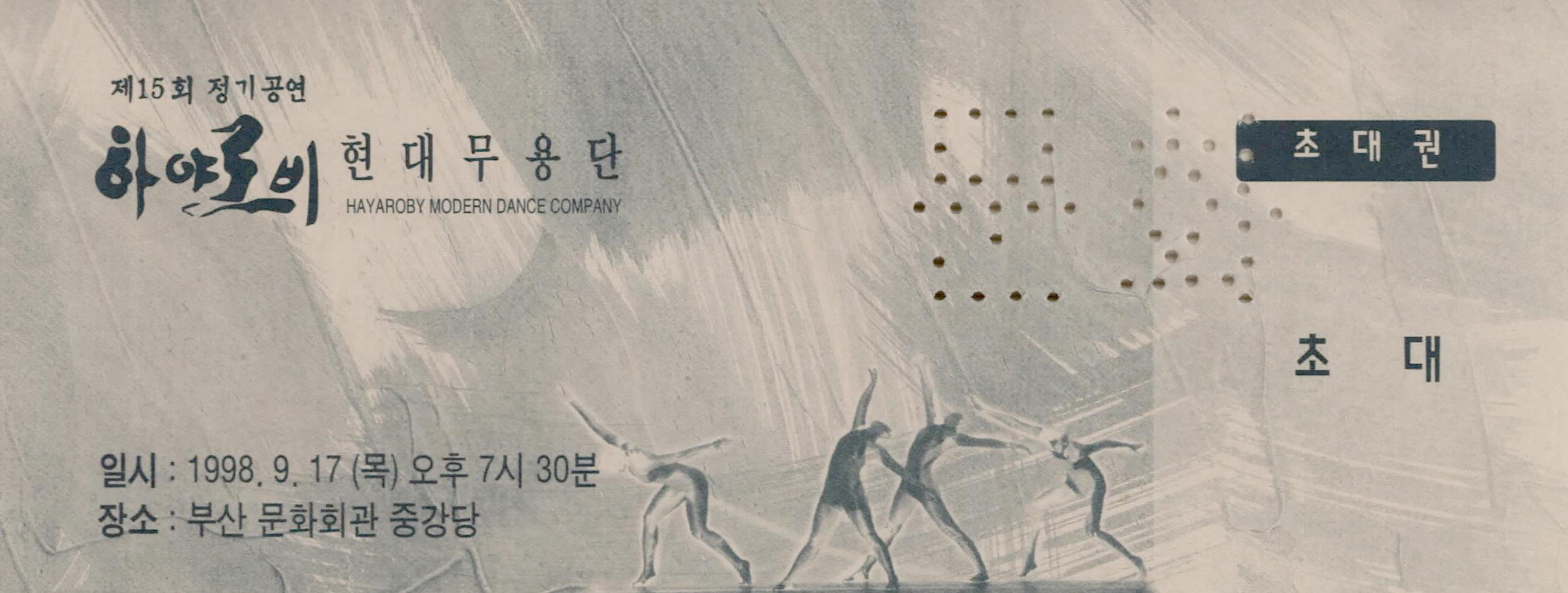 (초대권) 1998년 9월 17일 부산 문화회관 중강당에서 열린 《제15회 정기공연 하야로비 현대무용단》초대권이다. 공연 일시와 장소가 기술되어 있다.