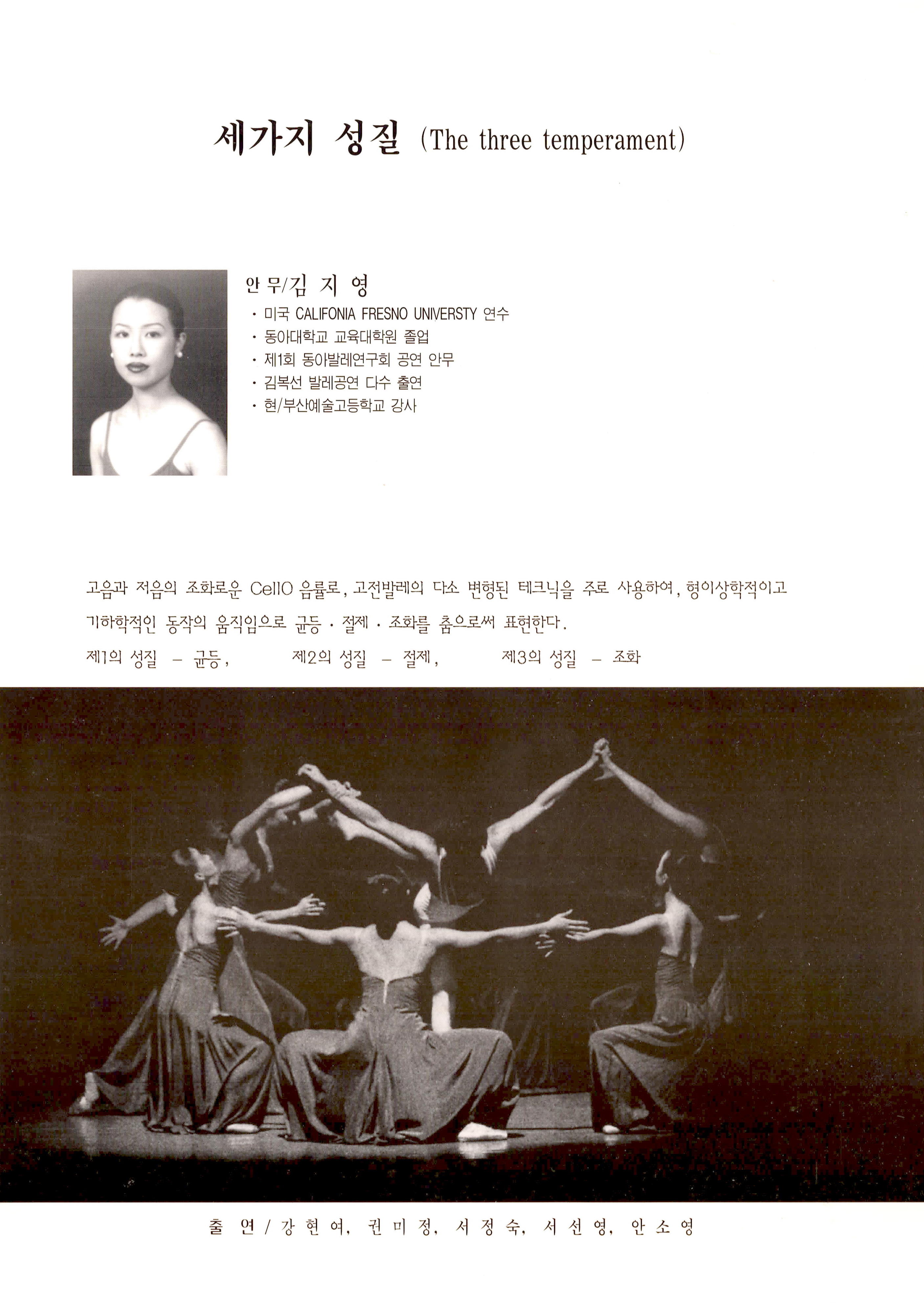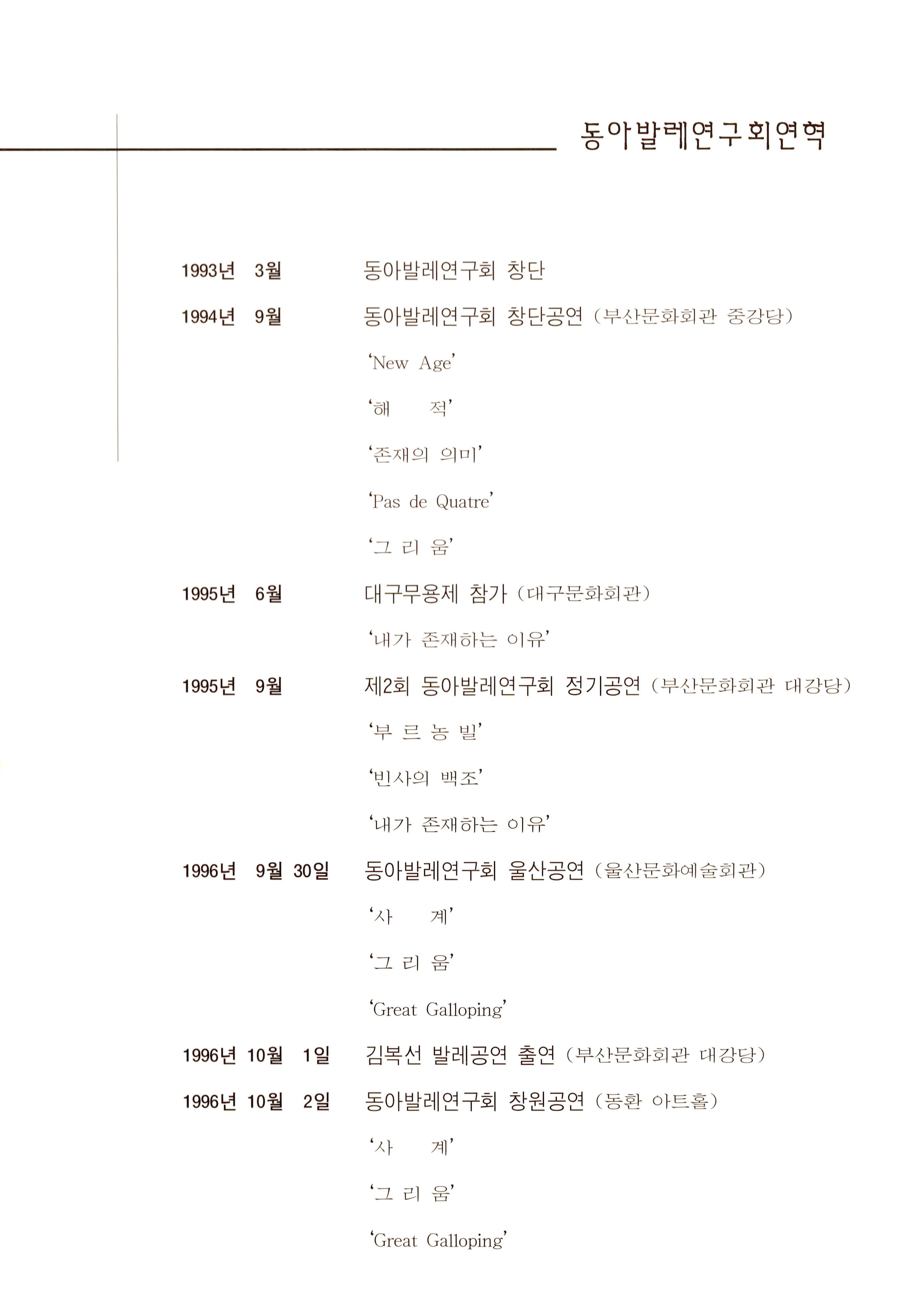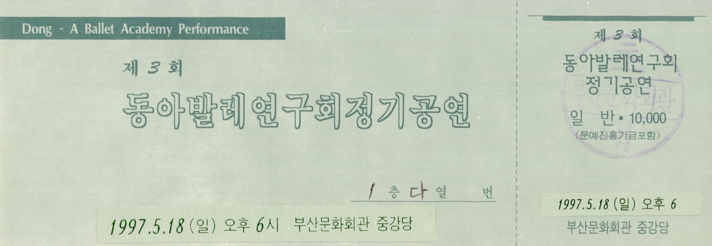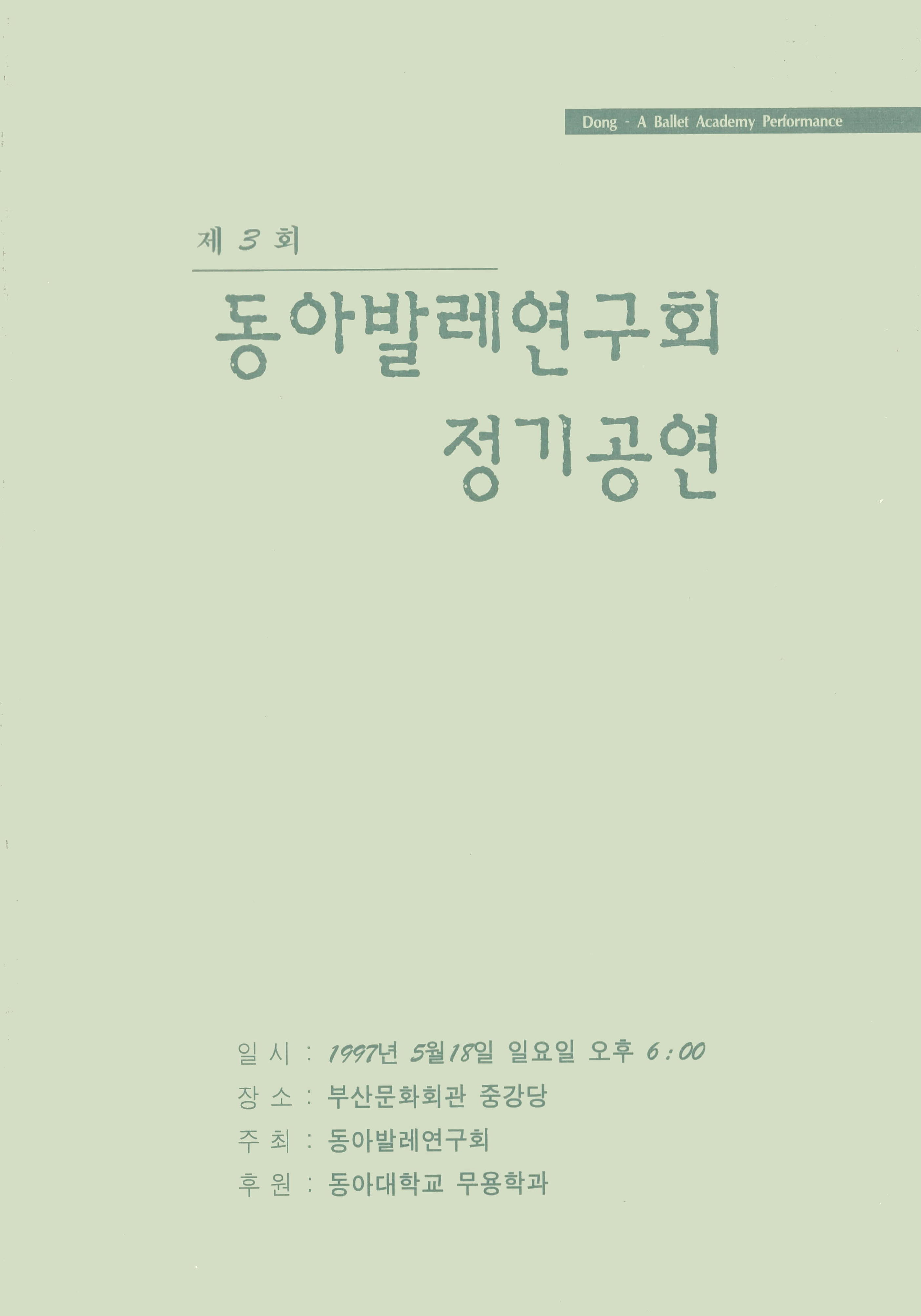 (팜플렛) 1997년 5월 18일에 부산문화회관 중강당에서 동아발레연구회가 공연한 《제3회 동아발레연구회 정기공연(Dong - A Ballet Academy Performance)》의 팜플렛이다. 팜플렛의 내용 안에는 동아발레연구회 예술감독 '김복선'의 격려사, 동아발레연구회 회장 '왕혜영'의 인사말이 기술되어 있으며 작품공연으로 '춘간(春間)', '세가지 성질(The three temperament)', '공중 도시(空中 都市)속에서'의 줄거리와 안무가의 사진·약력이 기술되어 있다. 추가적으로 출연자의 사진·명단 및 제작진의 명단, '동아발레연구회' 단원의 약력과 연혁을 끝으로 팜플렛 구성이 끝난다.