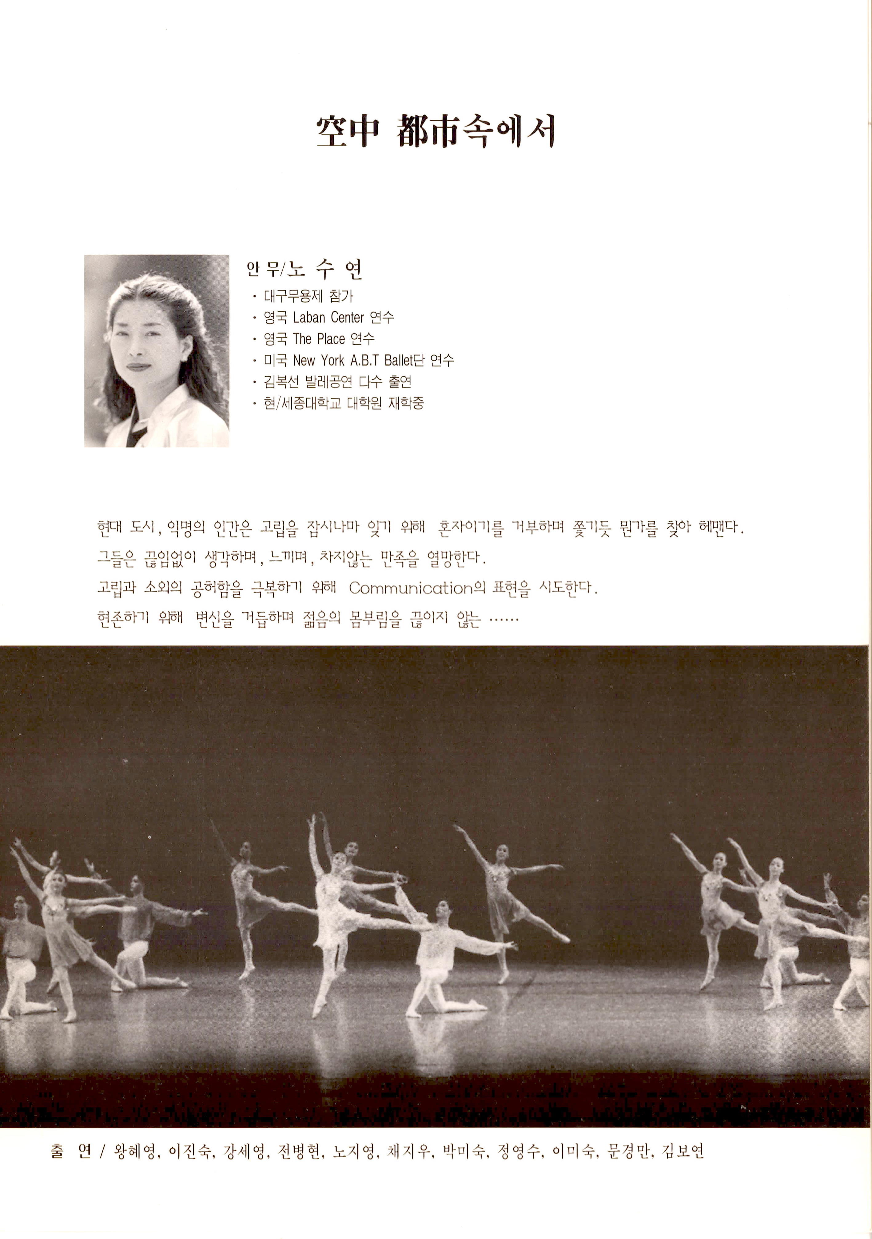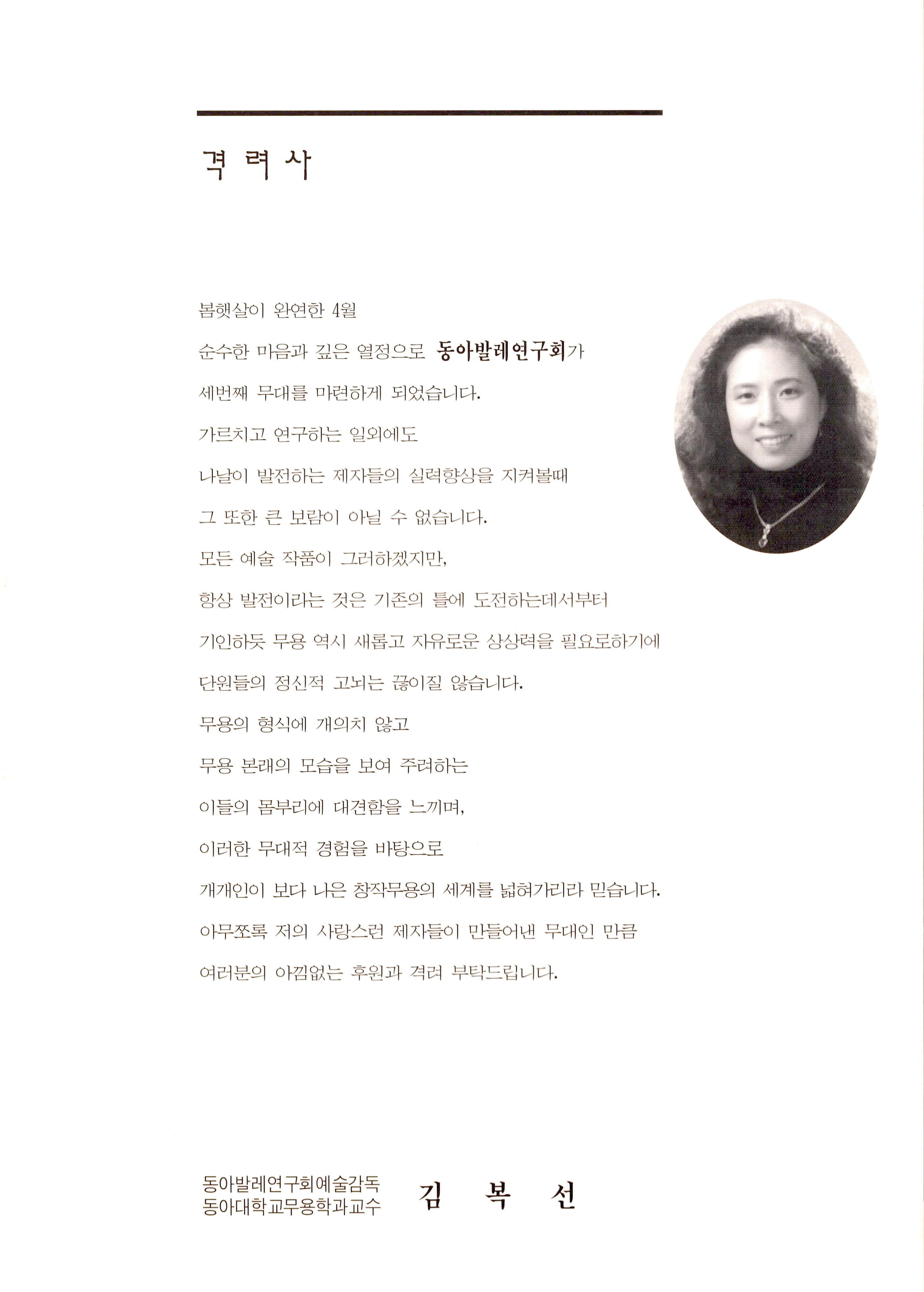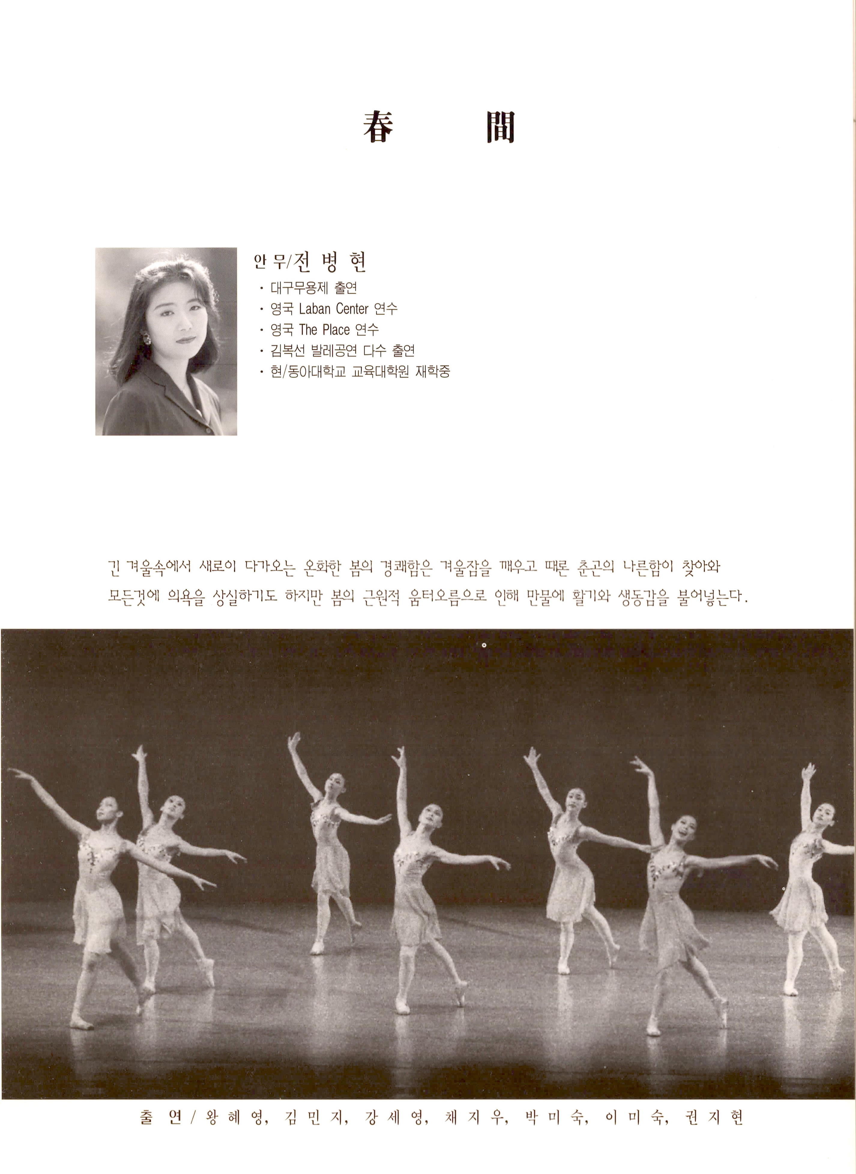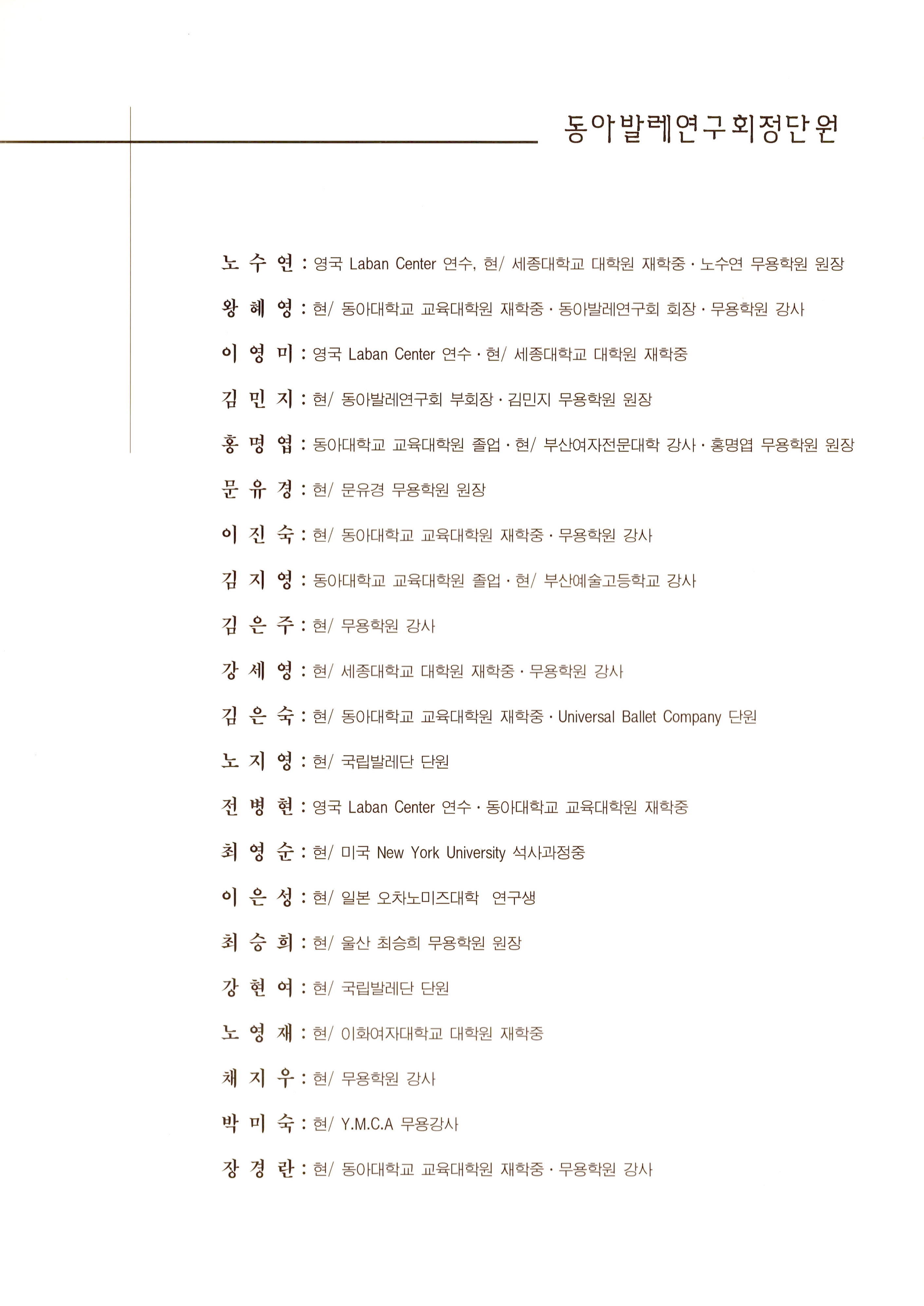 (팜플렛) 1997년 5월 18일에 부산문화회관 중강당에서 동아발레연구회가 공연한 《제3회 동아발레연구회 정기공연(Dong - A Ballet Academy Performance)》의 팜플렛이다. 팜플렛의 내용 안에는 동아발레연구회 예술감독 '김복선'의 격려사, 동아발레연구회 회장 '왕혜영'의 인사말이 기술되어 있으며 작품공연으로 '춘간(春間)', '세가지 성질(The three temperament)', '공중 도시(空中 都市)속에서'의 줄거리와 안무가의 사진·약력이 기술되어 있다. 추가적으로 출연자의 사진·명단 및 제작진의 명단, '동아발레연구회' 단원의 약력과 연혁을 끝으로 팜플렛 구성이 끝난다.