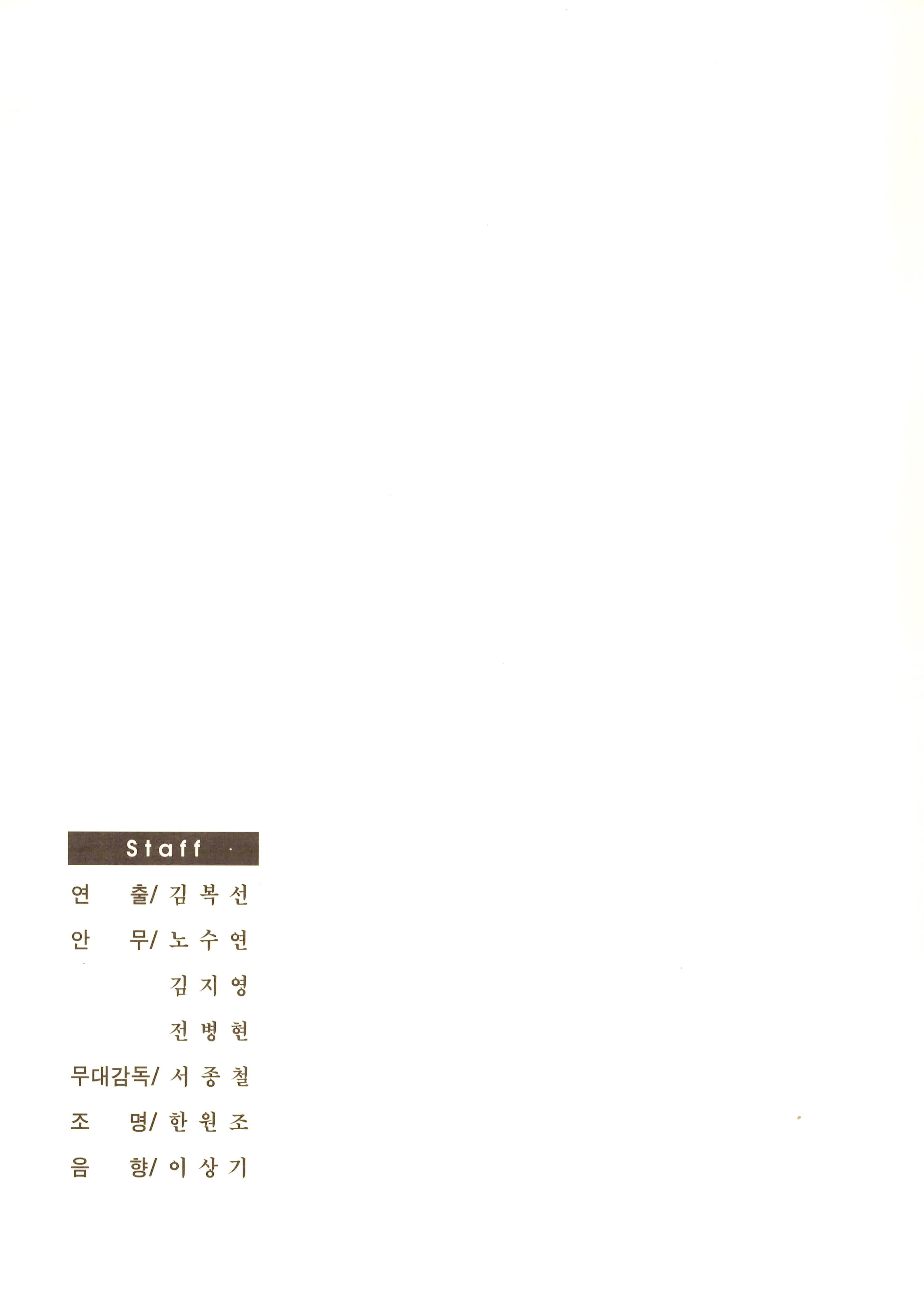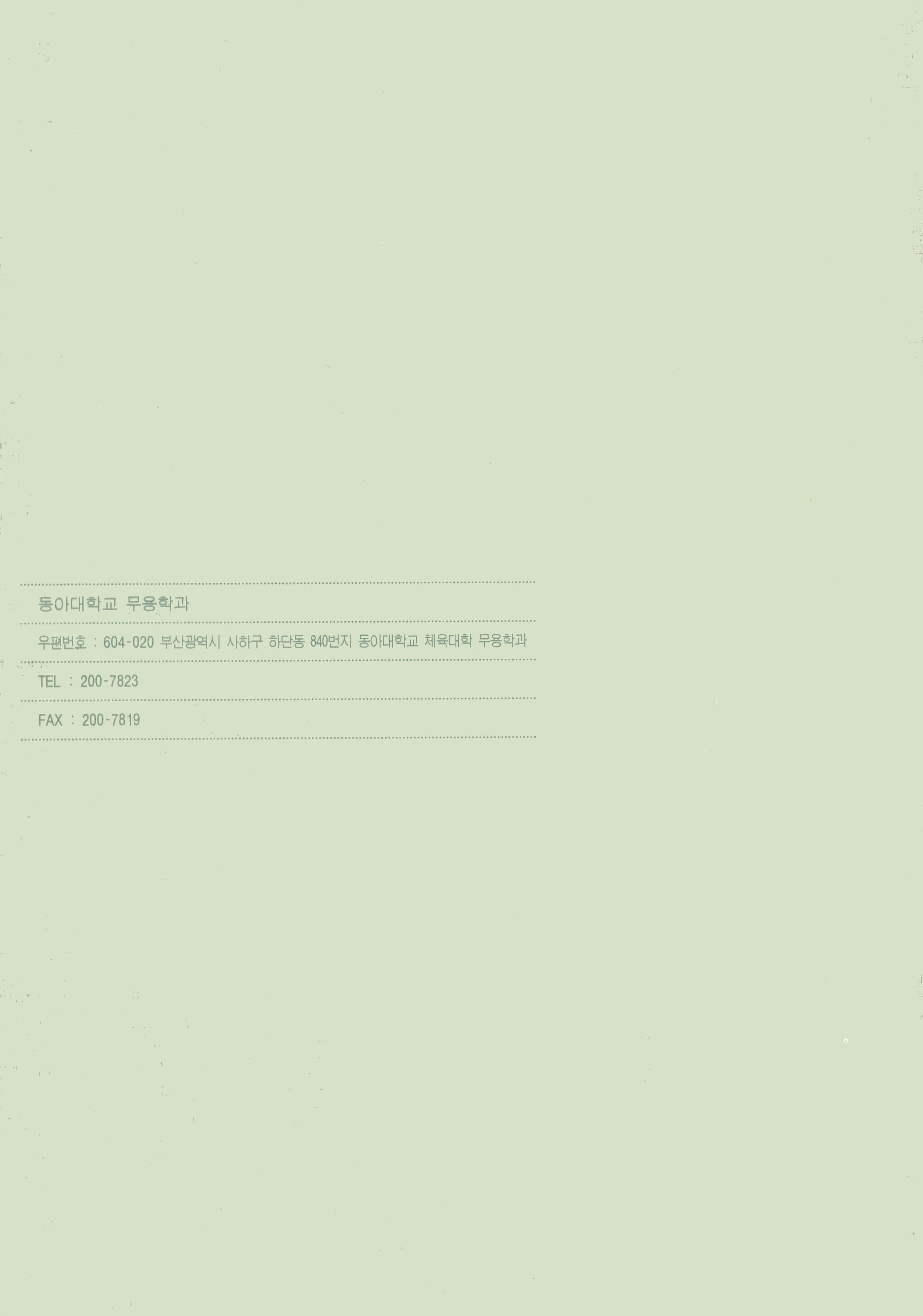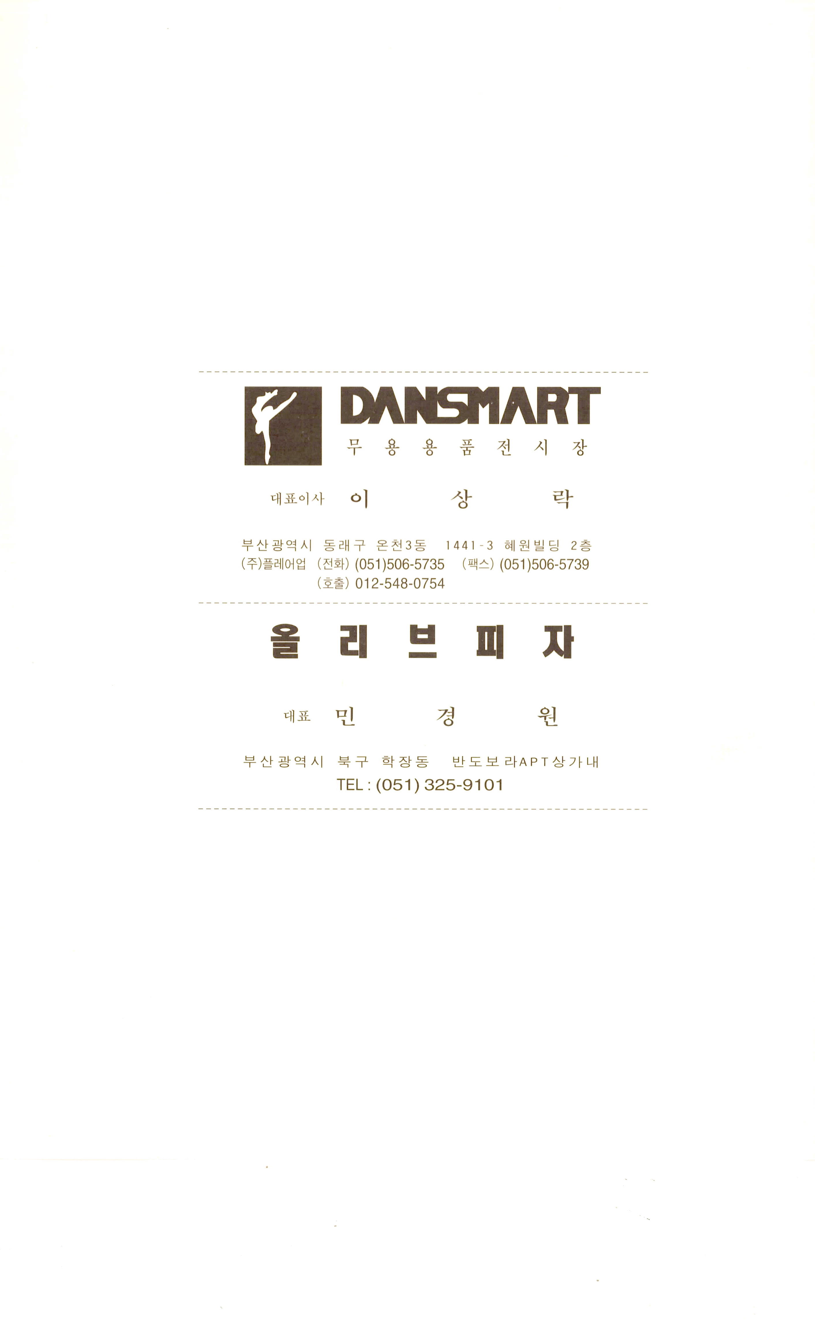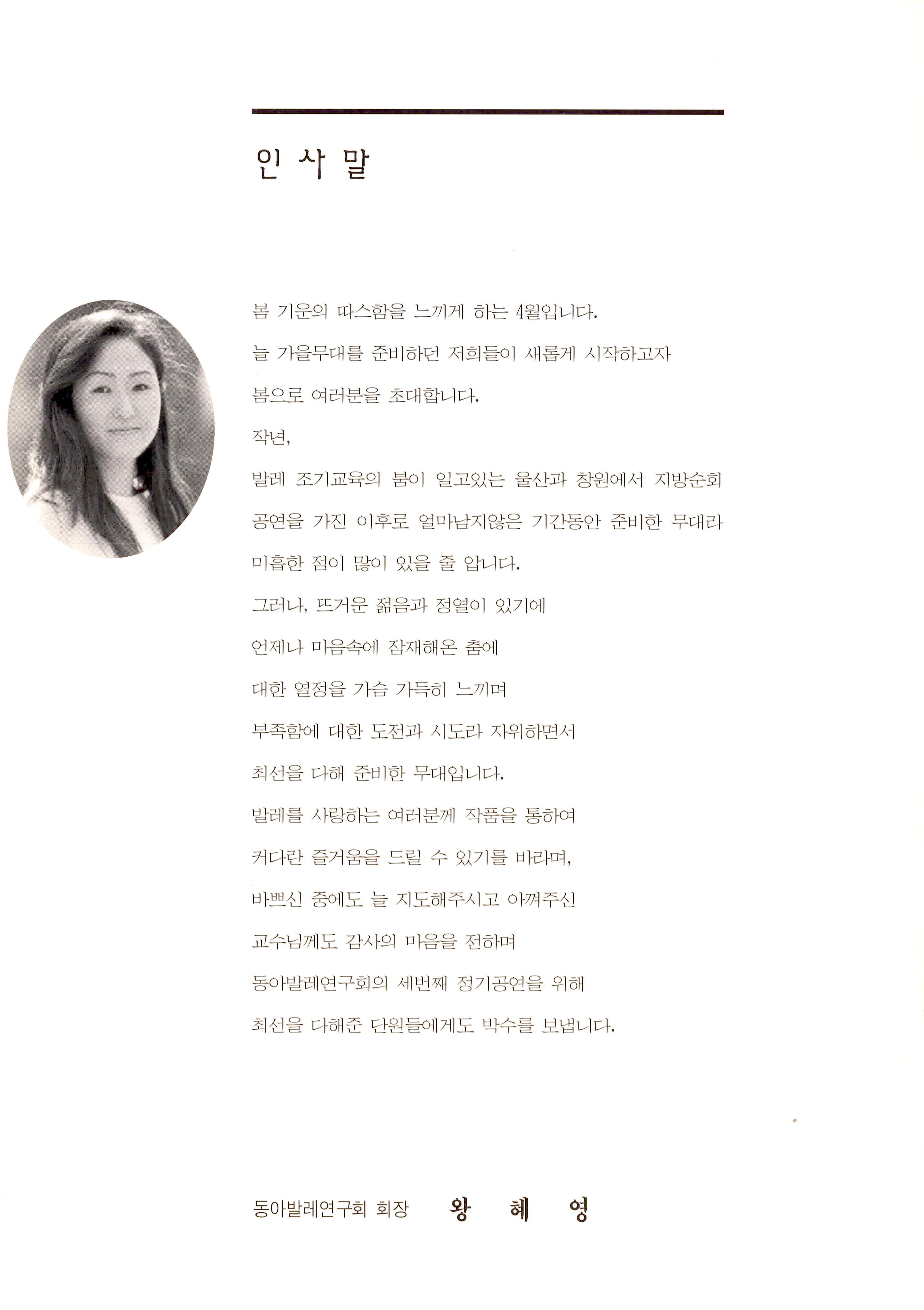 (팜플렛) 1997년 5월 18일에 부산문화회관 중강당에서 동아발레연구회가 공연한 《제3회 동아발레연구회 정기공연(Dong - A Ballet Academy Performance)》의 팜플렛이다. 팜플렛의 내용 안에는 동아발레연구회 예술감독 '김복선'의 격려사, 동아발레연구회 회장 '왕혜영'의 인사말이 기술되어 있으며 작품공연으로 '춘간(春間)', '세가지 성질(The three temperament)', '공중 도시(空中 都市)속에서'의 줄거리와 안무가의 사진·약력이 기술되어 있다. 추가적으로 출연자의 사진·명단 및 제작진의 명단, '동아발레연구회' 단원의 약력과 연혁을 끝으로 팜플렛 구성이 끝난다.