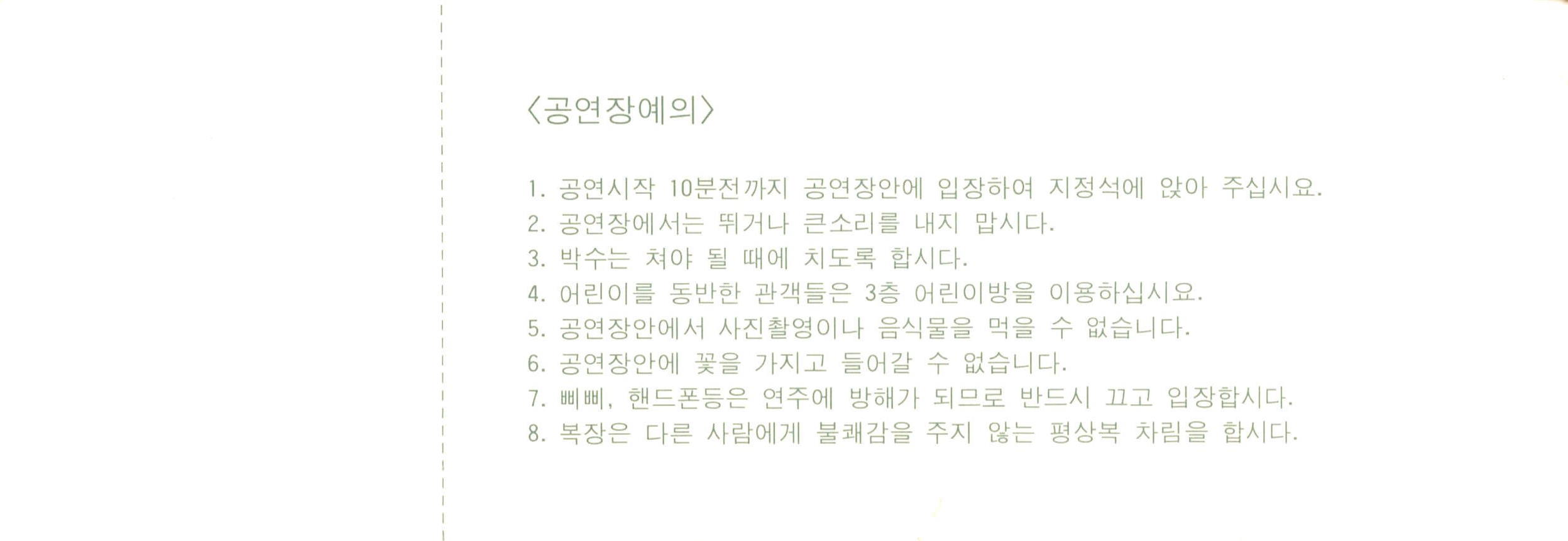 (초대권) 1999년 4월 15일 경성대학교 콘서트홀에서 열린 《제5회 정기공연 동아발레연구회》 초대권이다. 공연 일시와 장소, 후원(동아대학교 무용학과), 주의사항이 기술되어 있다.