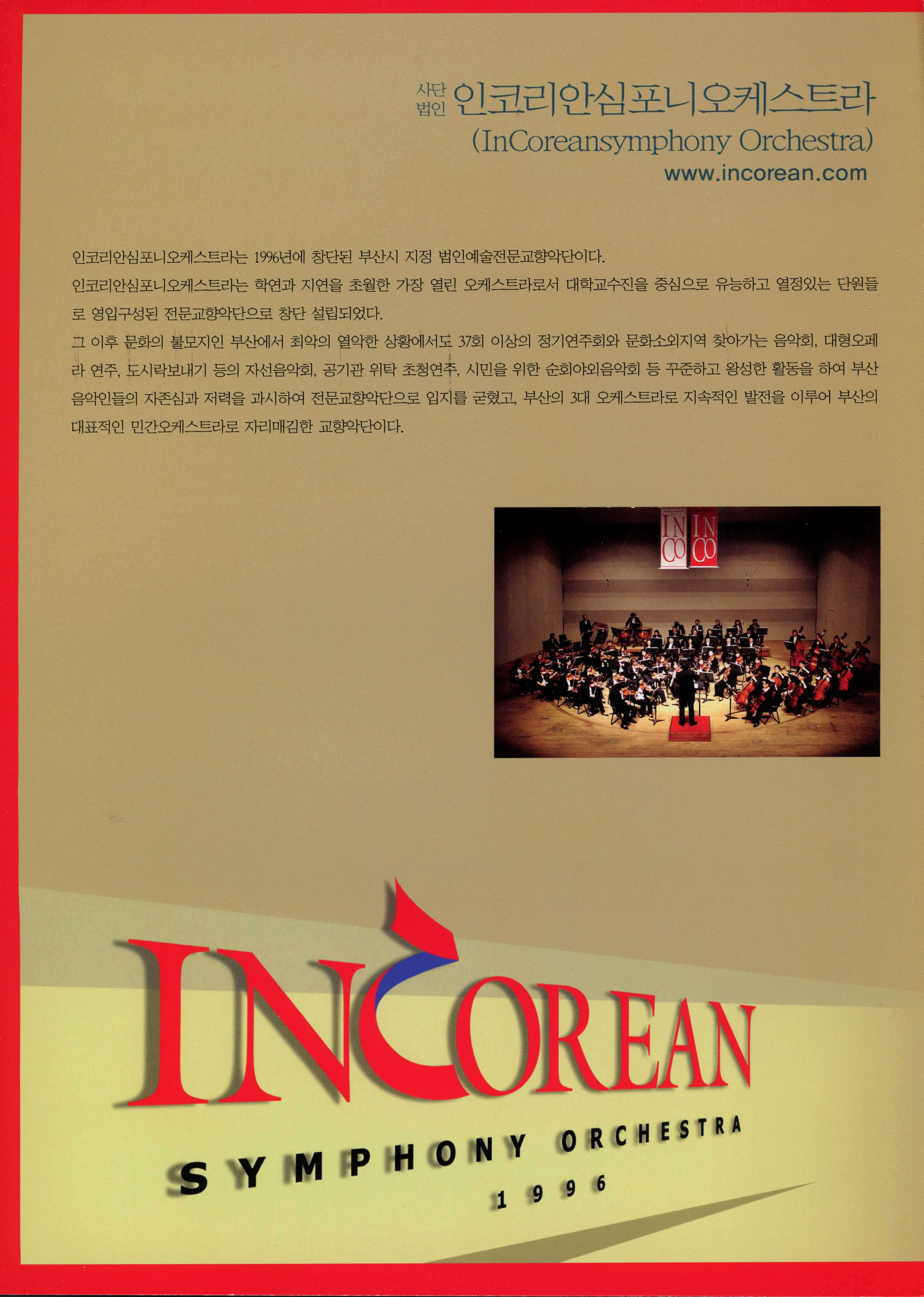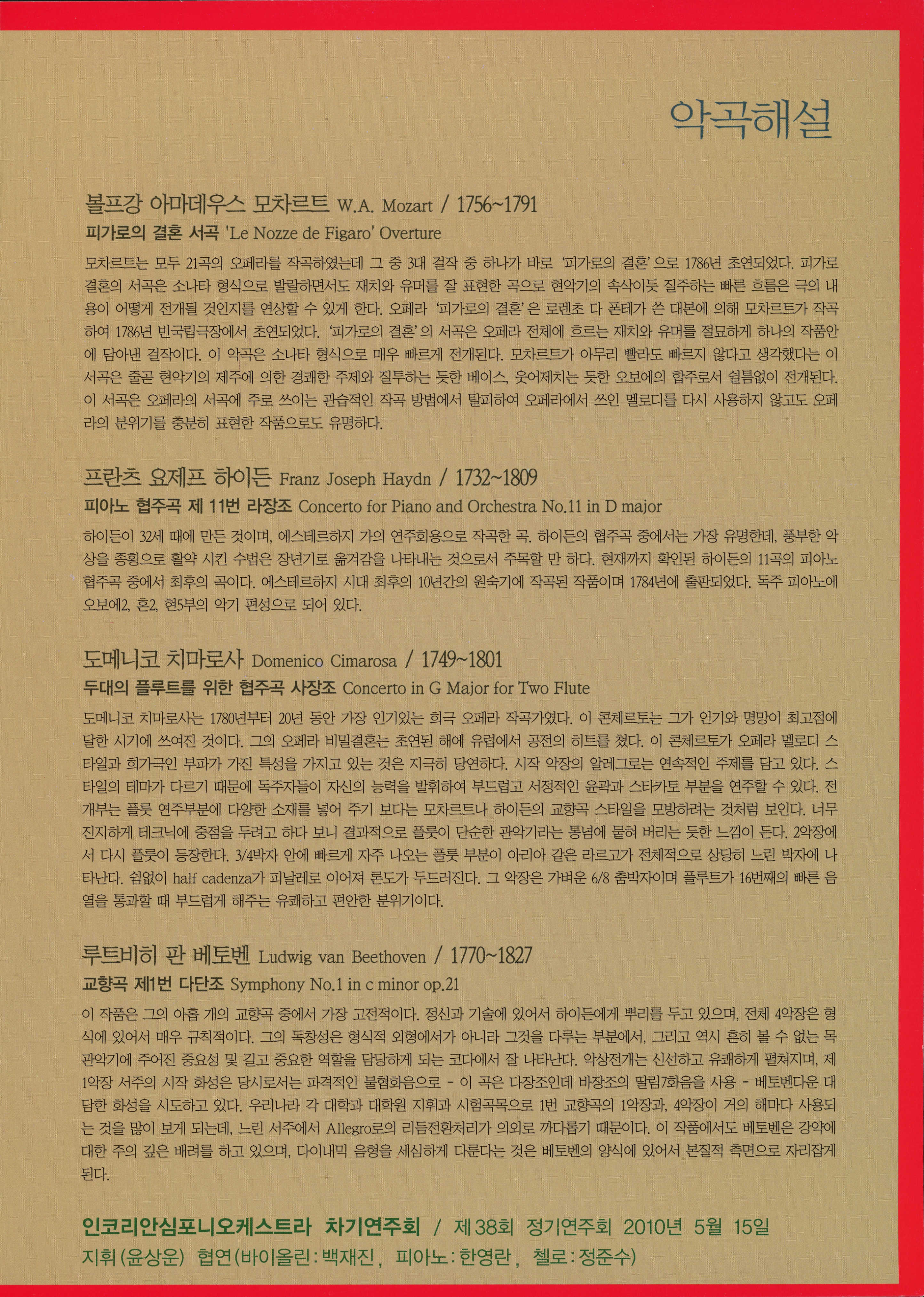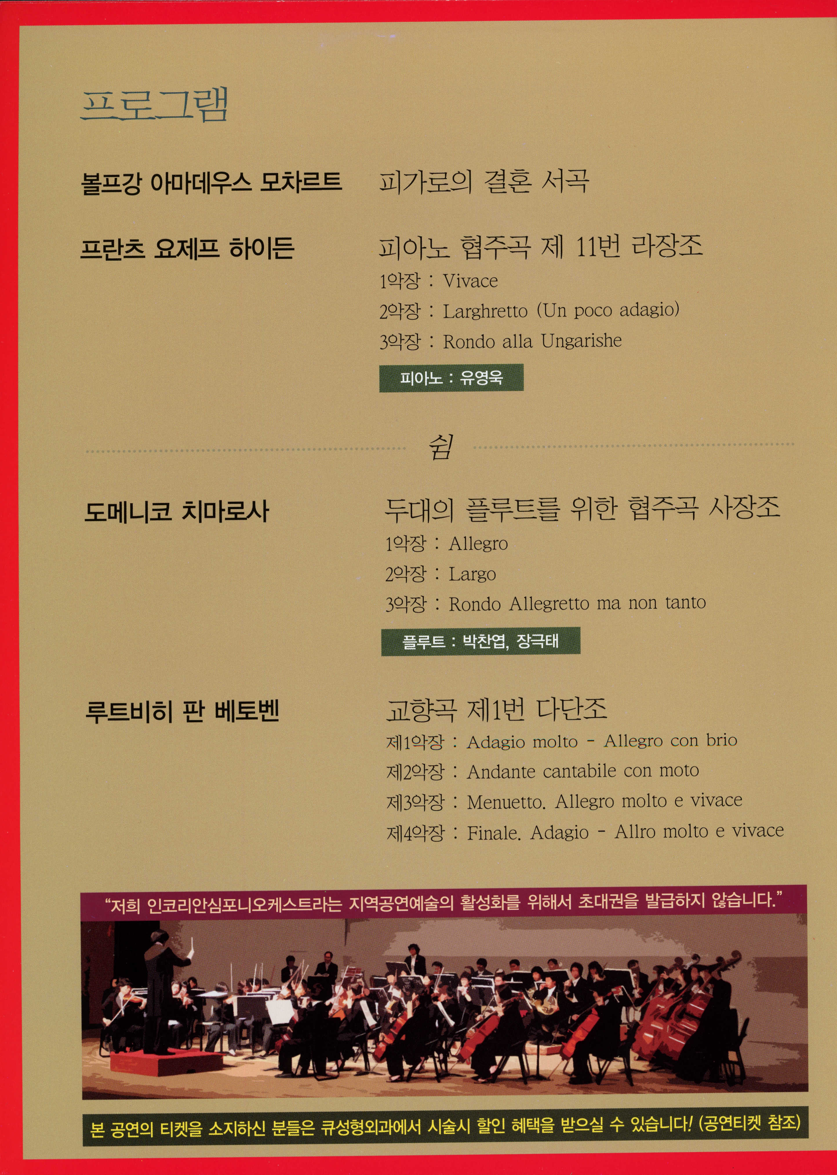 2010년 3월 29일 부산문화회관 대극장에서 인코리안심포니오케스트라에서 주최한 《제37회 인코리안심포니오케스트라 정기연주회 : INCO 베토벤의 첫 교향곡 베토벤 교향곡 제 1번》리플릿이다. 인코리안심포니오케스트라에 대한 설명과 연주자 소개(지휘 유호석, 플루트 박찬엽, 장극태, 피아노 유영욱)과 프로그램 구성(볼프강 아카데우스 '피가로의 결혼 서곡', 프란츠 요제프 하이든 '피아노 협주곡 제11번 라장조, 도메니코 치바로사 '두대의 플루트를 위한 협주곡 사장조', 루트비히 판 베토벤 '교향곡 제11번 다단조', ), 각 악곡의 해설, 인코리안심포니의 연혁이 기술되어 있다.