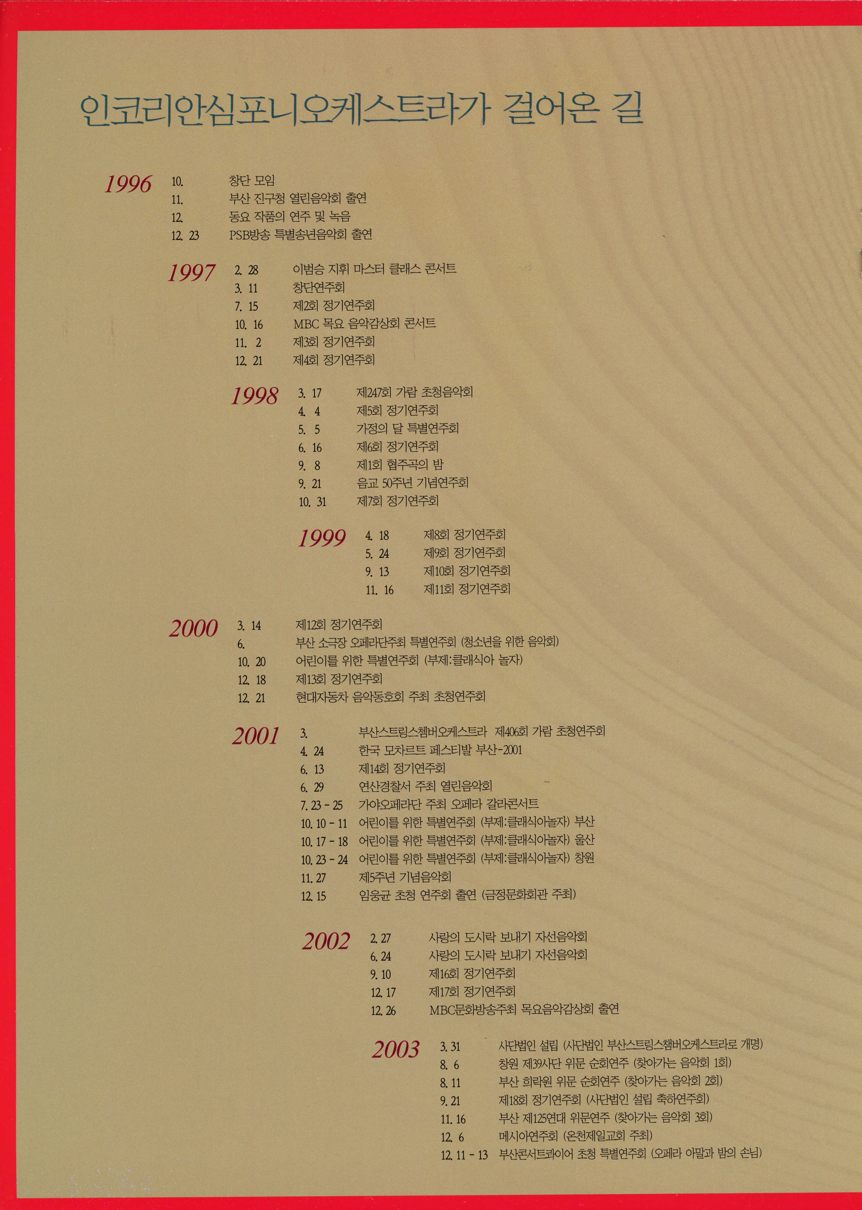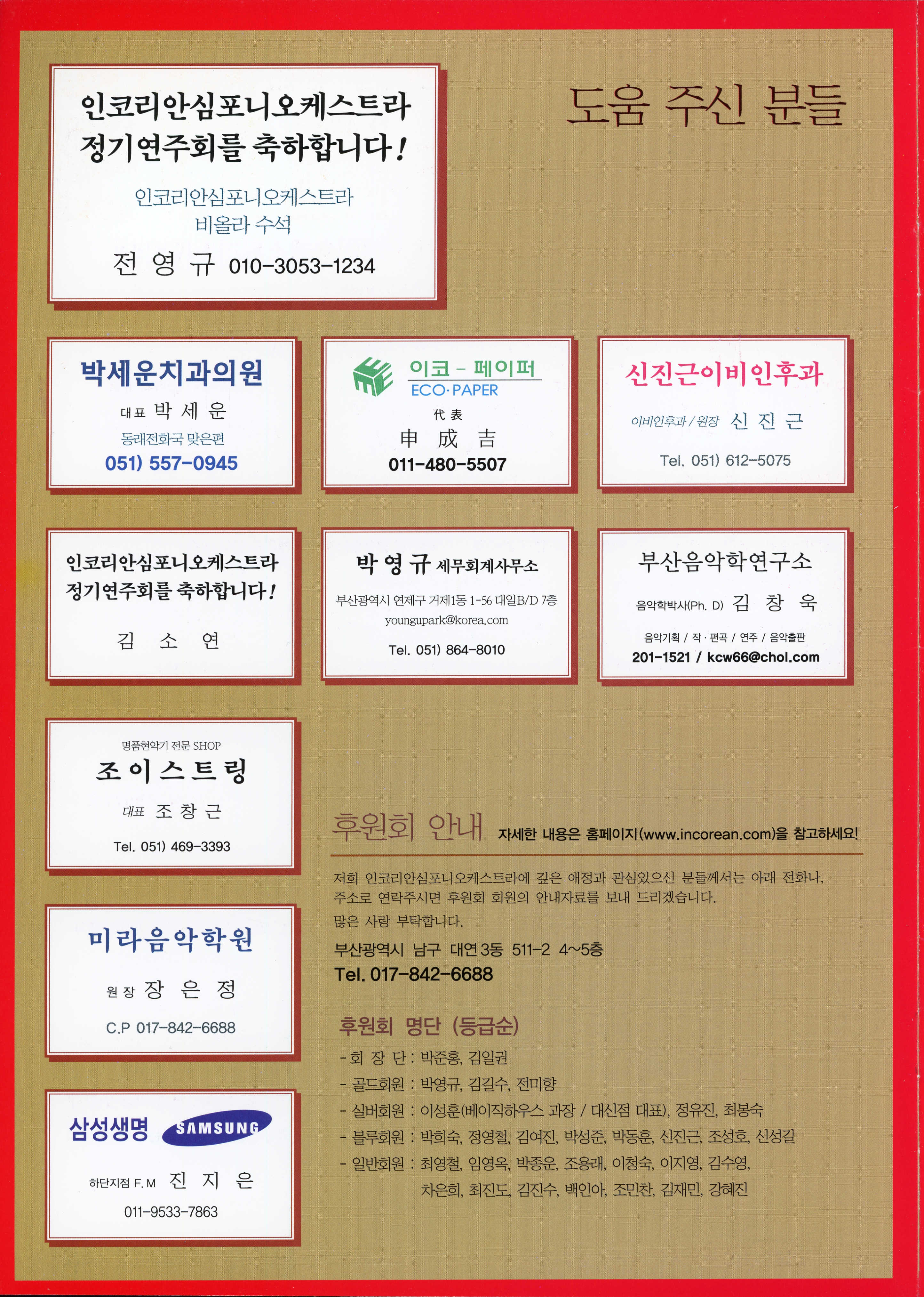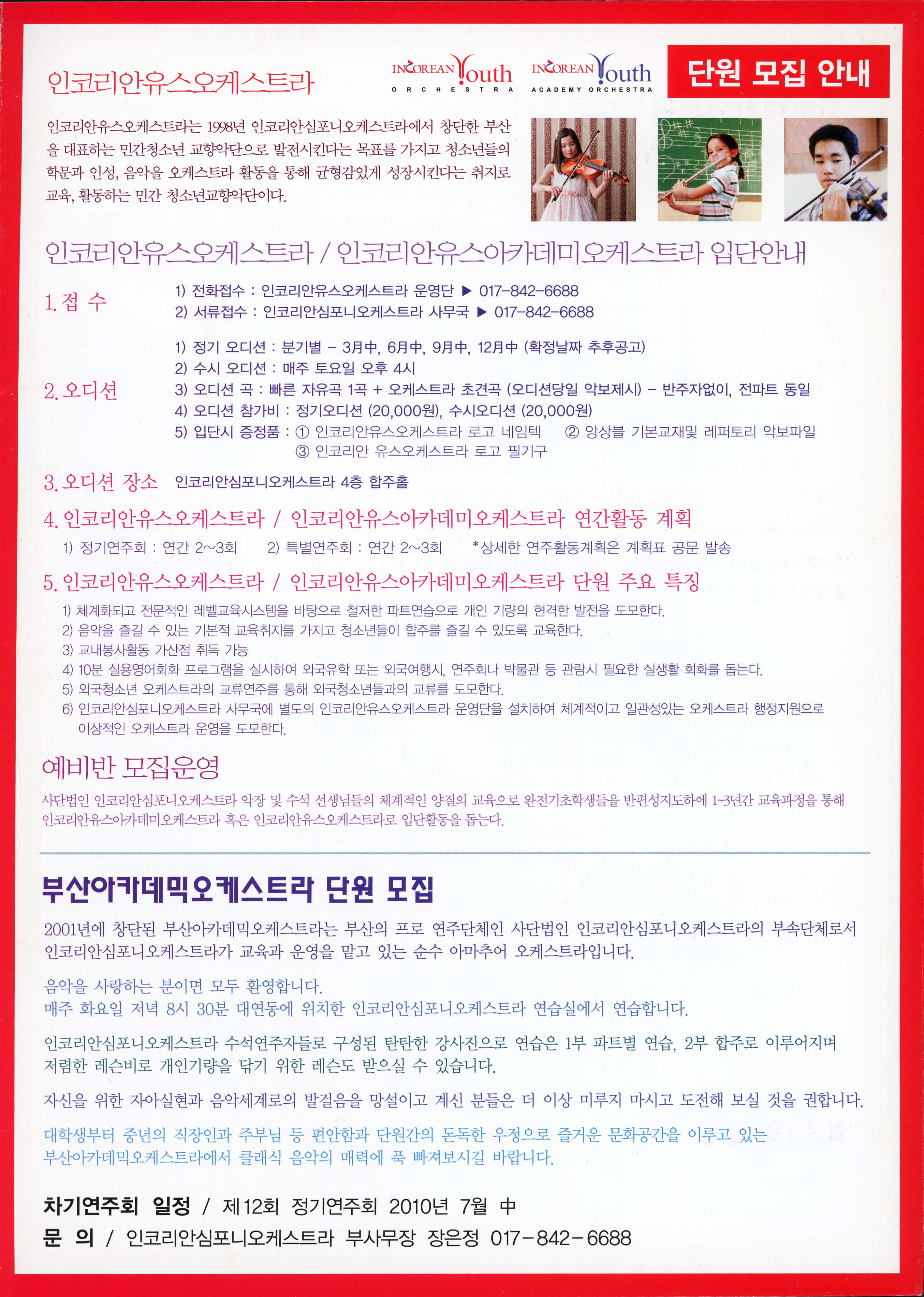 2010년 3월 29일 부산문화회관 대극장에서 인코리안심포니오케스트라에서 주최한 《제37회 인코리안심포니오케스트라 정기연주회 : INCO 베토벤의 첫 교향곡 베토벤 교향곡 제 1번》리플릿이다. 인코리안심포니오케스트라에 대한 설명과 연주자 소개(지휘 유호석, 플루트 박찬엽, 장극태, 피아노 유영욱)과 프로그램 구성(볼프강 아카데우스 '피가로의 결혼 서곡', 프란츠 요제프 하이든 '피아노 협주곡 제11번 라장조, 도메니코 치바로사 '두대의 플루트를 위한 협주곡 사장조', 루트비히 판 베토벤 '교향곡 제11번 다단조', ), 각 악곡의 해설, 인코리안심포니의 연혁이 기술되어 있다.
