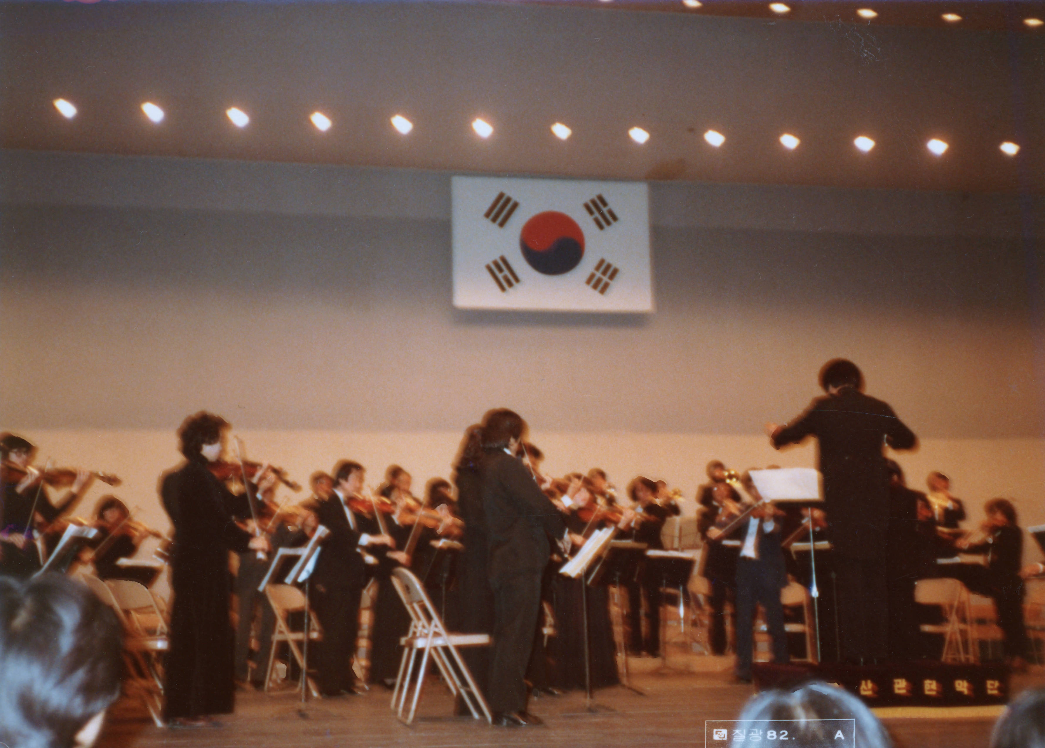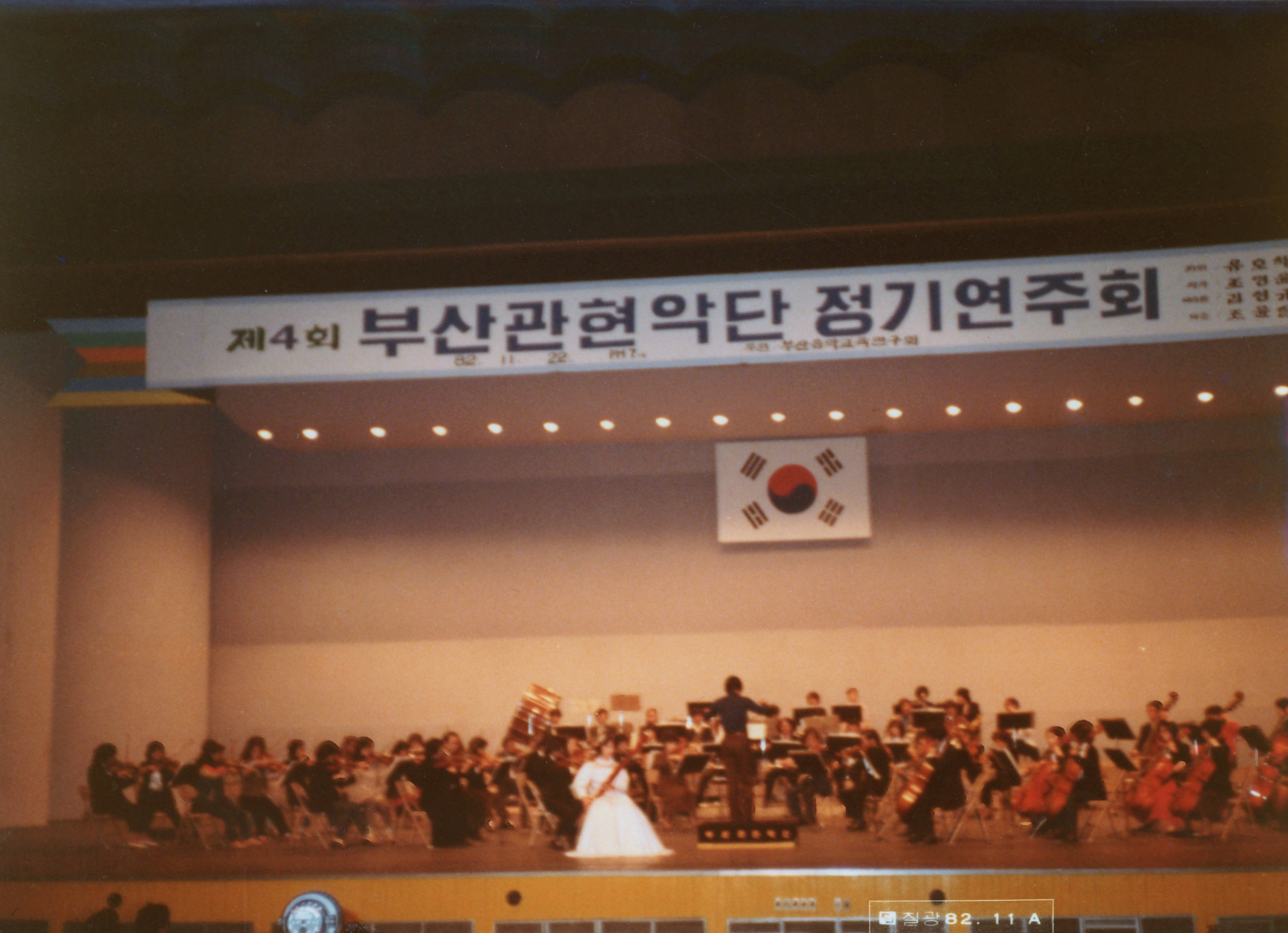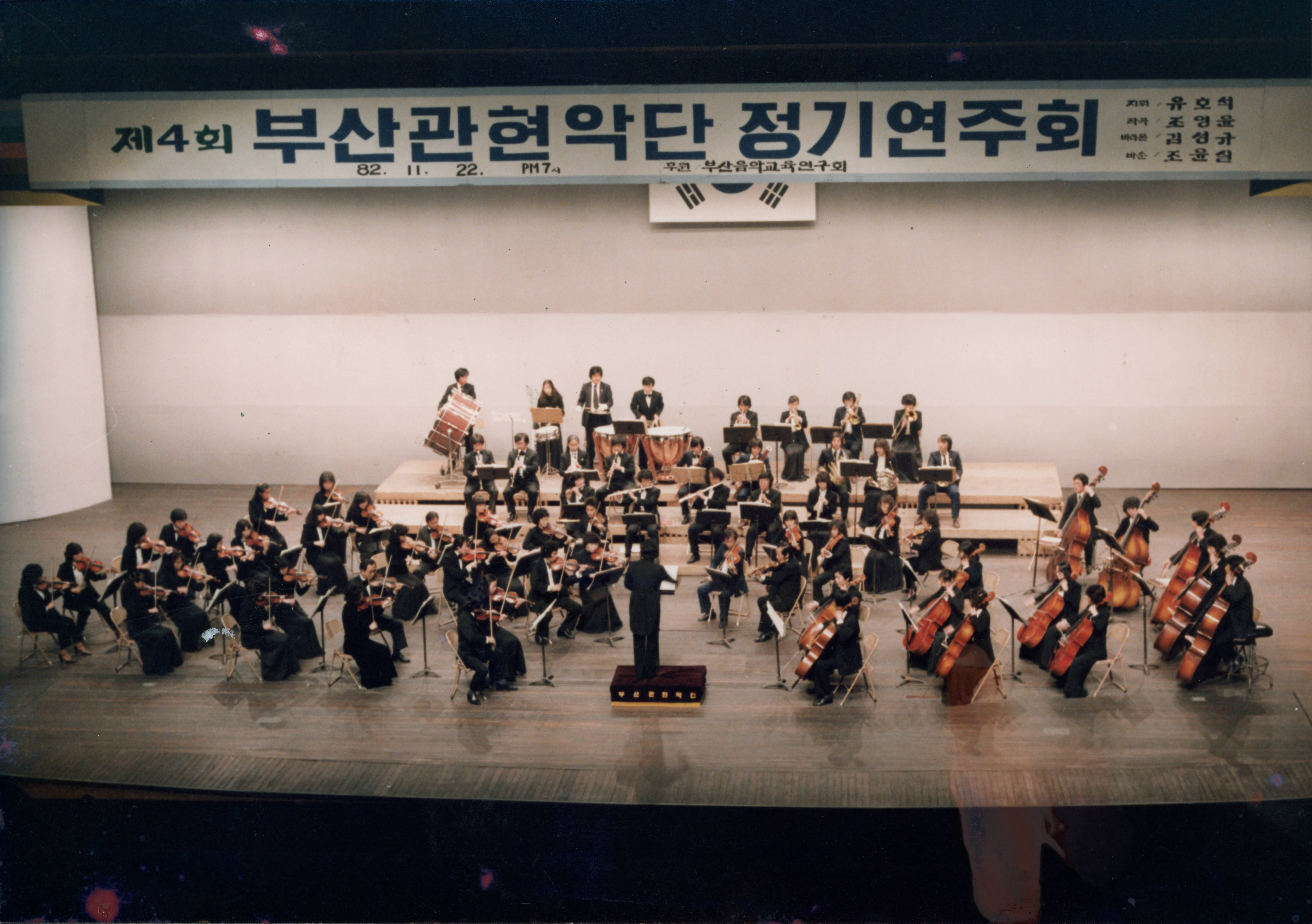 1982년에 촬영된 《제4회 부산관현악단 정기연주회- 지휘 유호석》 인화사진이다.