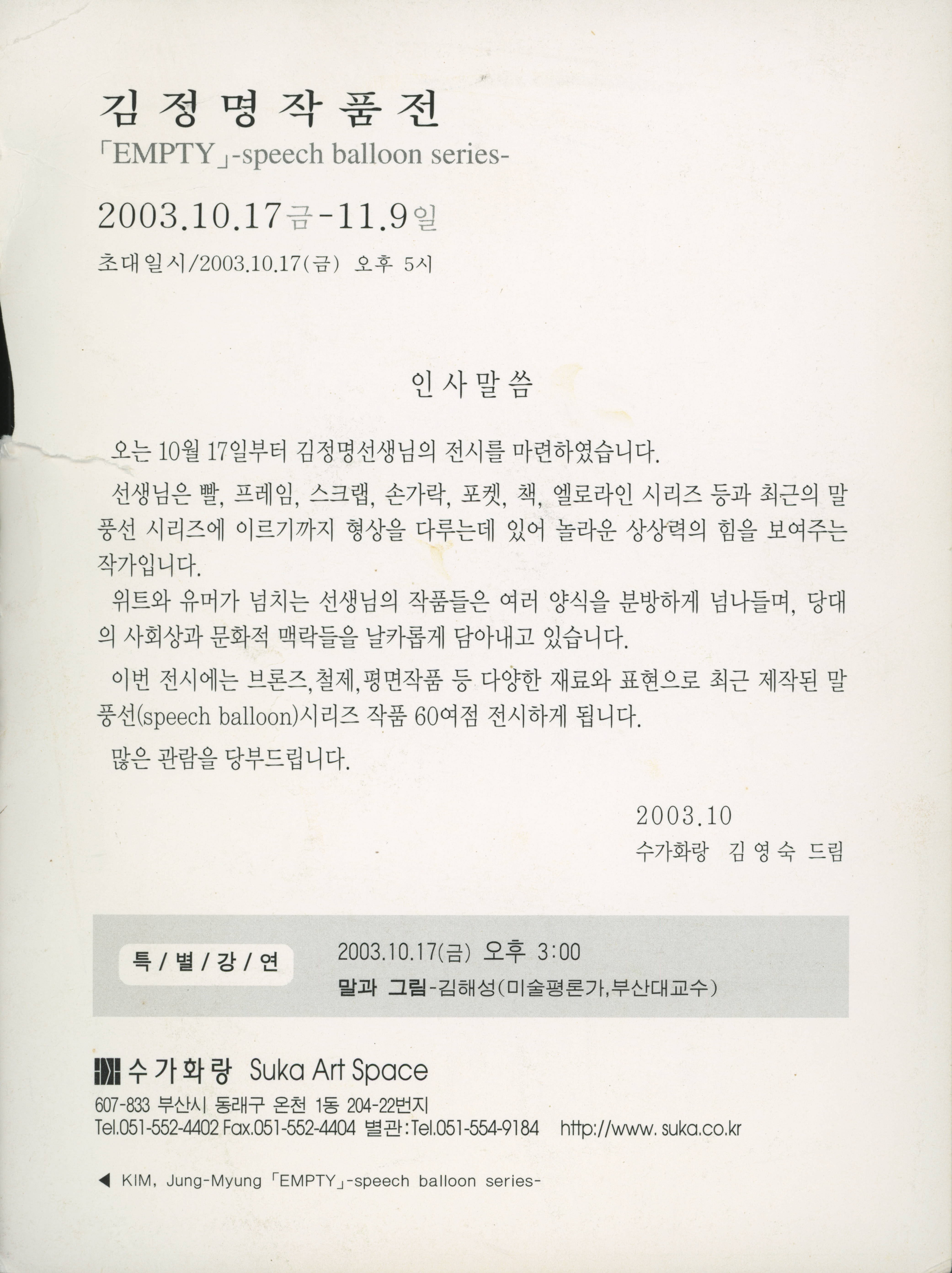 《EMPTY-speech ballon series(말풍선 시리즈) 김정명 작품전》 초대장