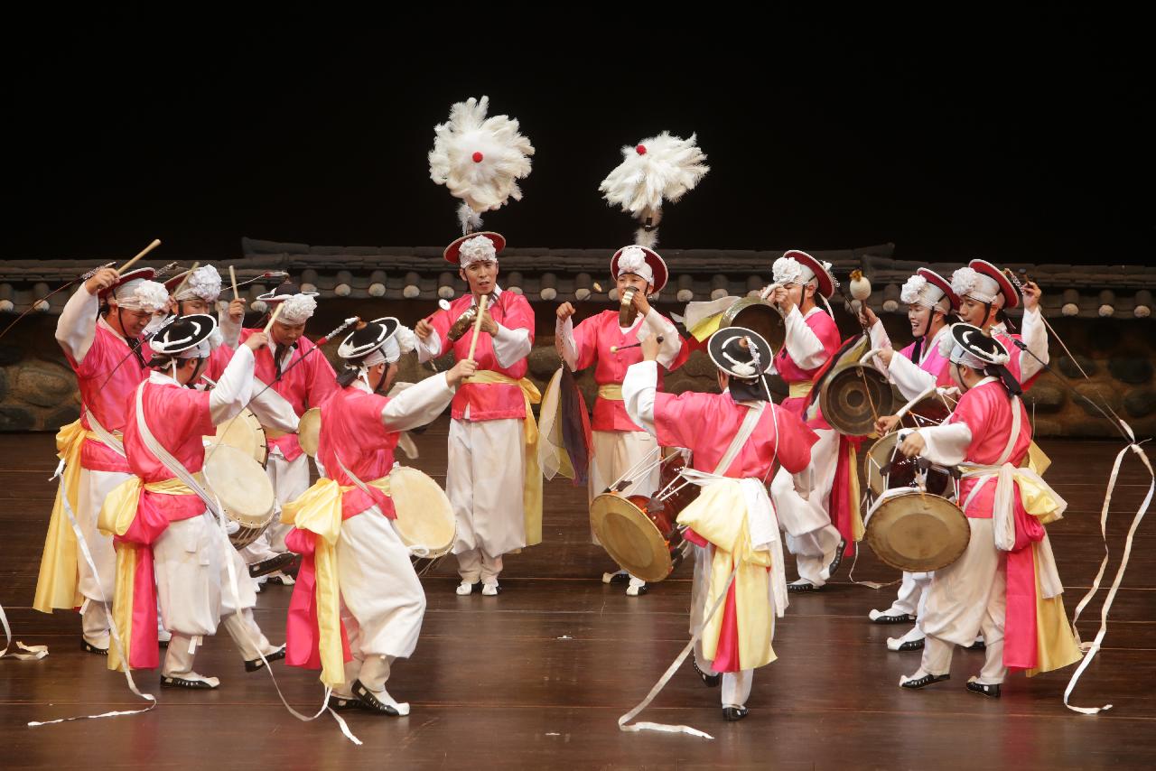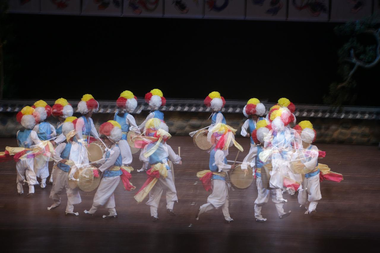 사물 판굿의 신명과 경상도 지역의 남성적인 역동성이 어우러진 작품이다.