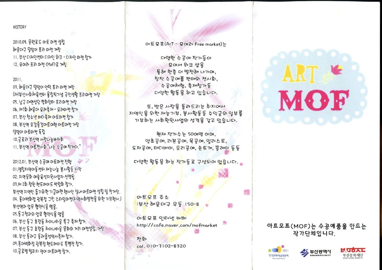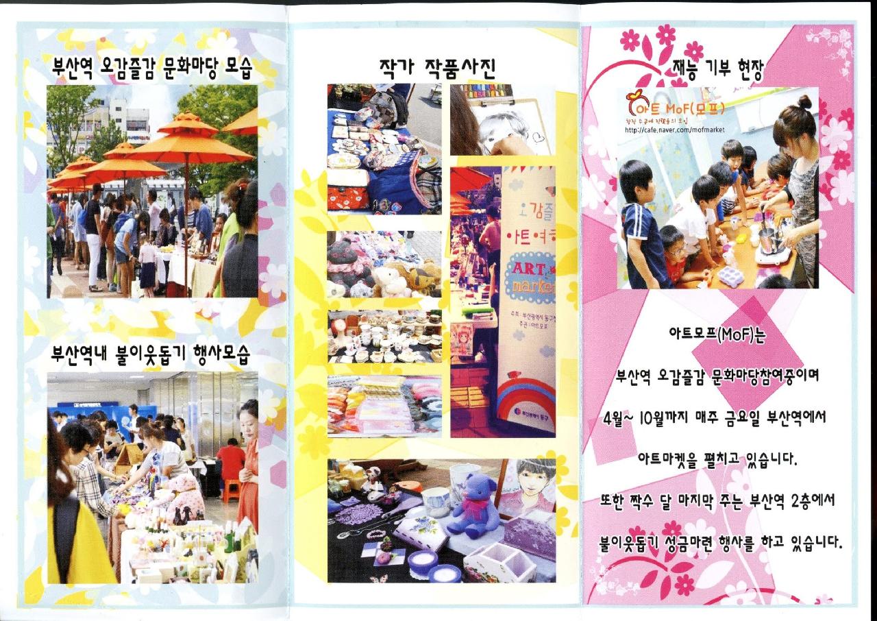 2010년 부터 현재까지 모여라 아트프리마켓(이하 모프)은 부산의 주요 관광지인 해운대 해월정, 부산역광장, 해운대 거리 등에서 시민들에게 다양한 수공예품을 직접 보고 접할수 있는 기회를 제공하였음. 이로인해 수공예품에 대한 인식전환의 계기를 마련하고 다양한 문화컨텐츠를 보여줬을 뿐 아니라 지역 작가들의 창작활동 영역 확장시켰음. 모프는 이에 더 나아가 시민과 더 가까이 소통할수 있는 '아트 서포터즈'를 만들고자 함.