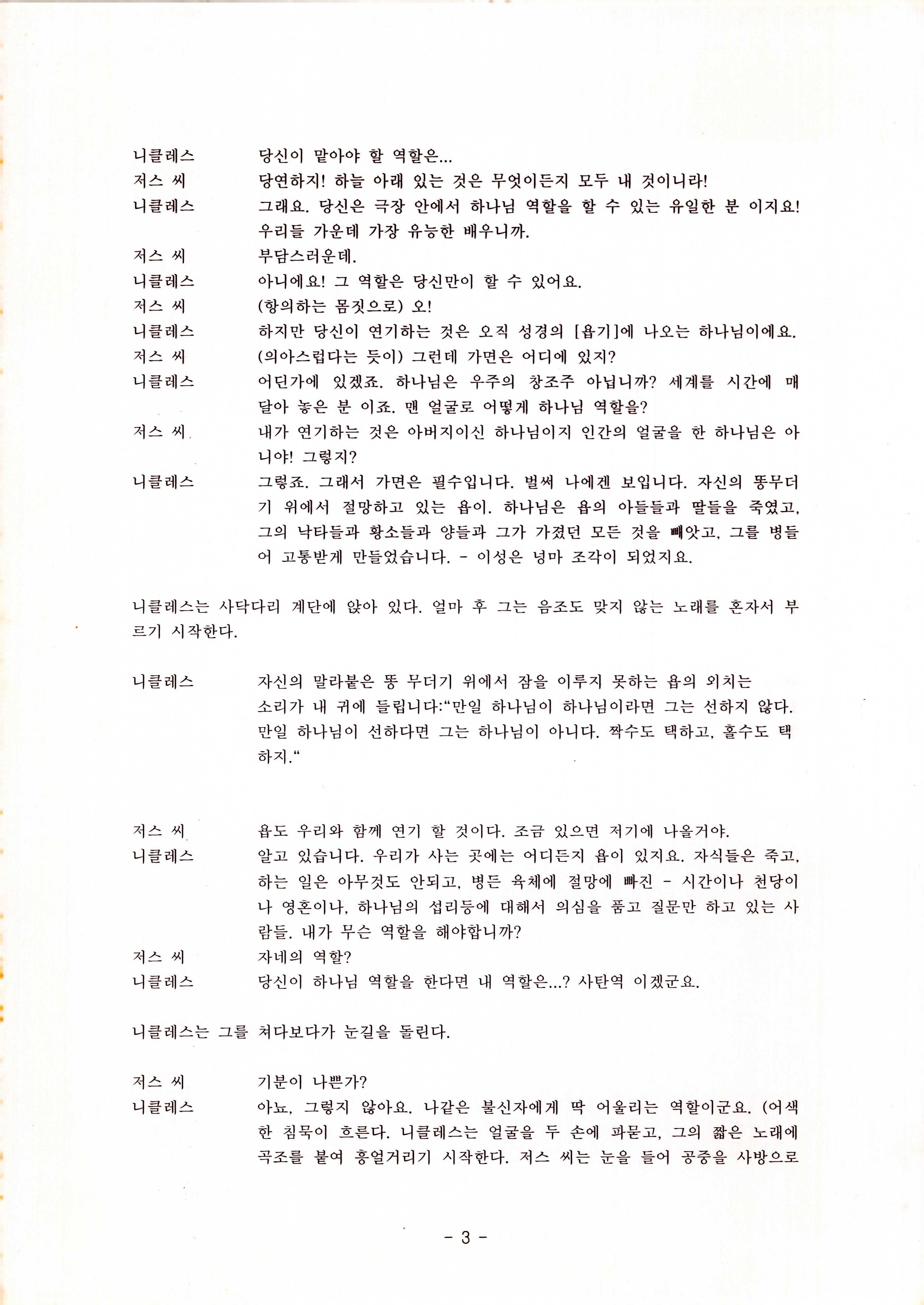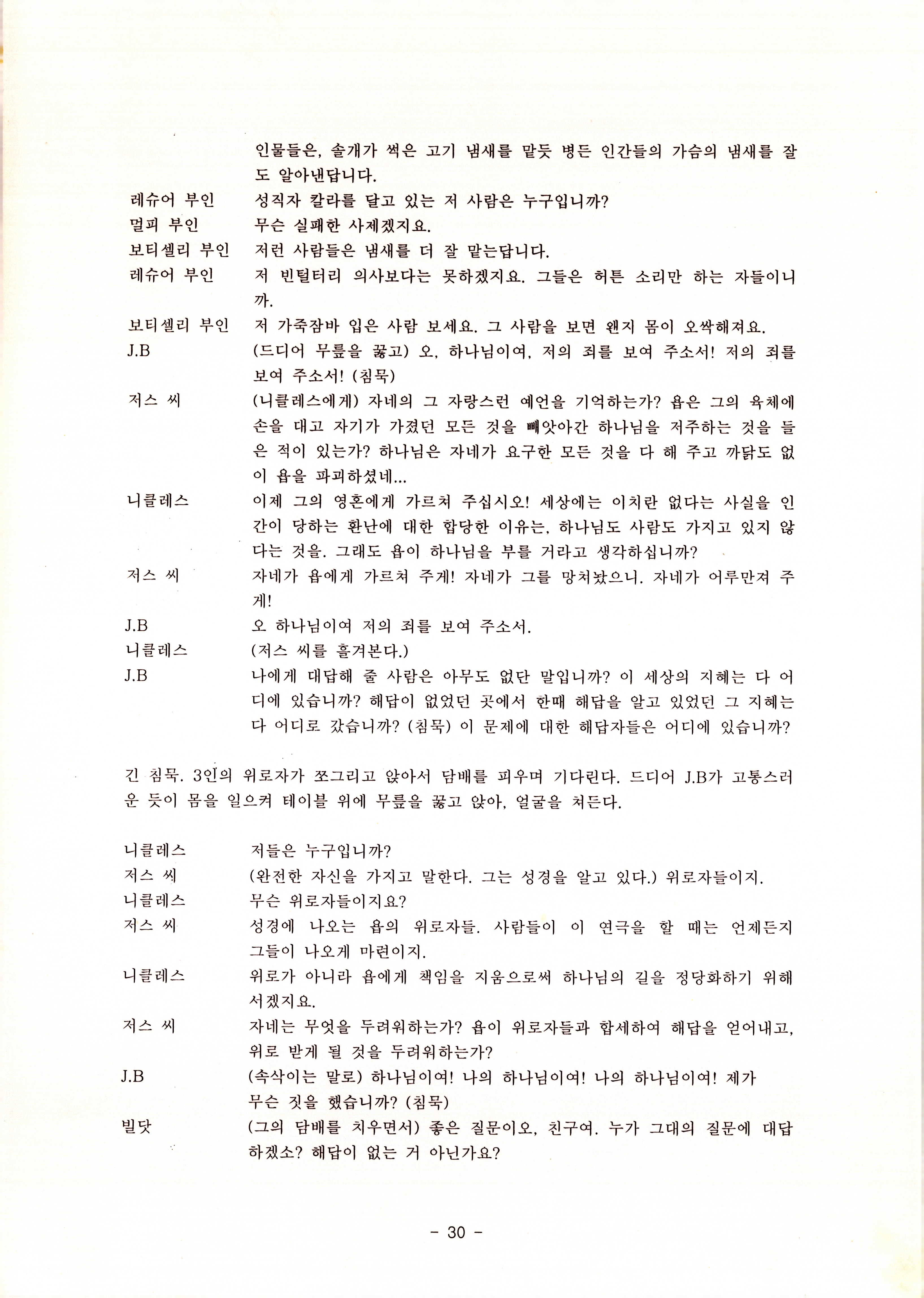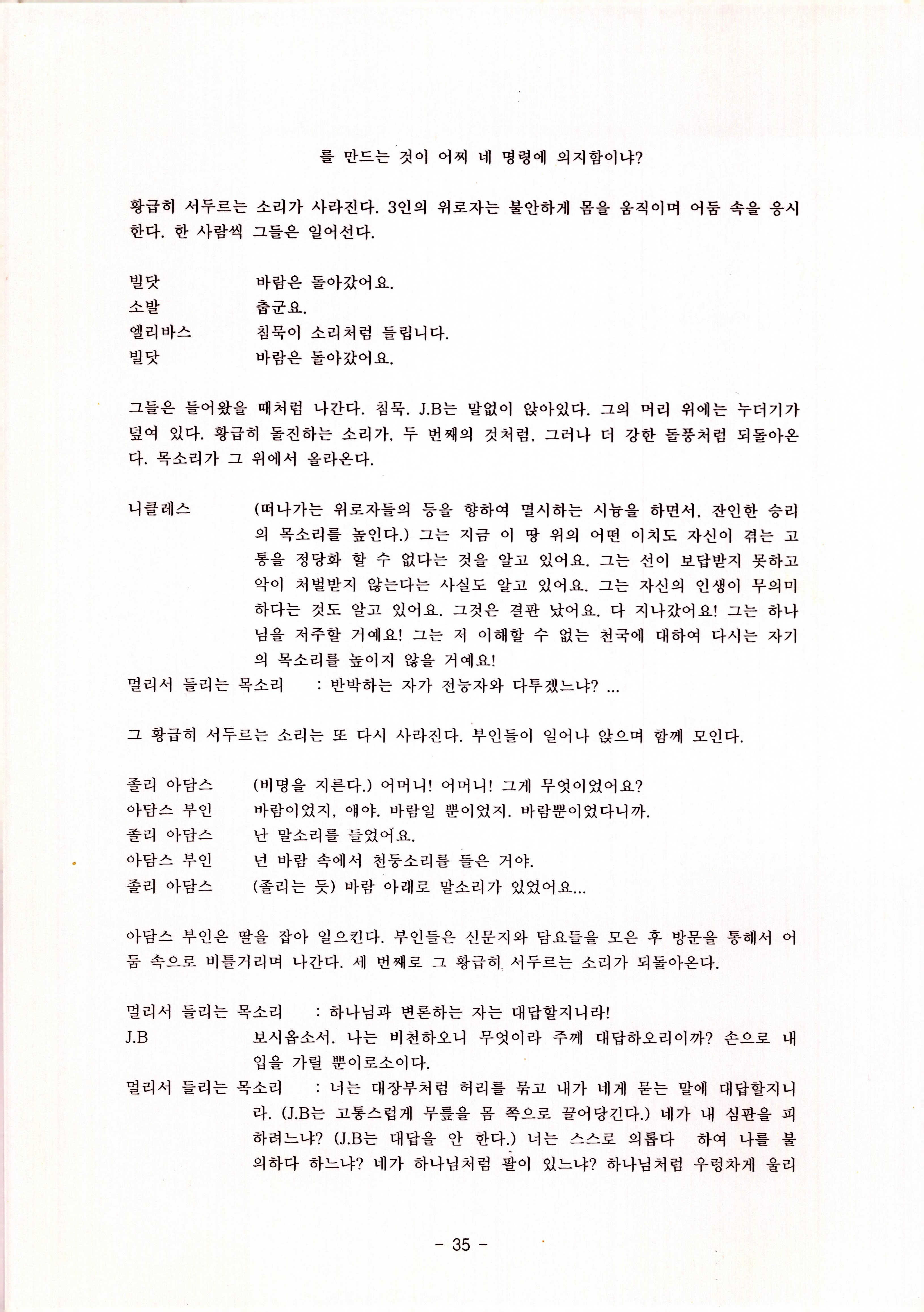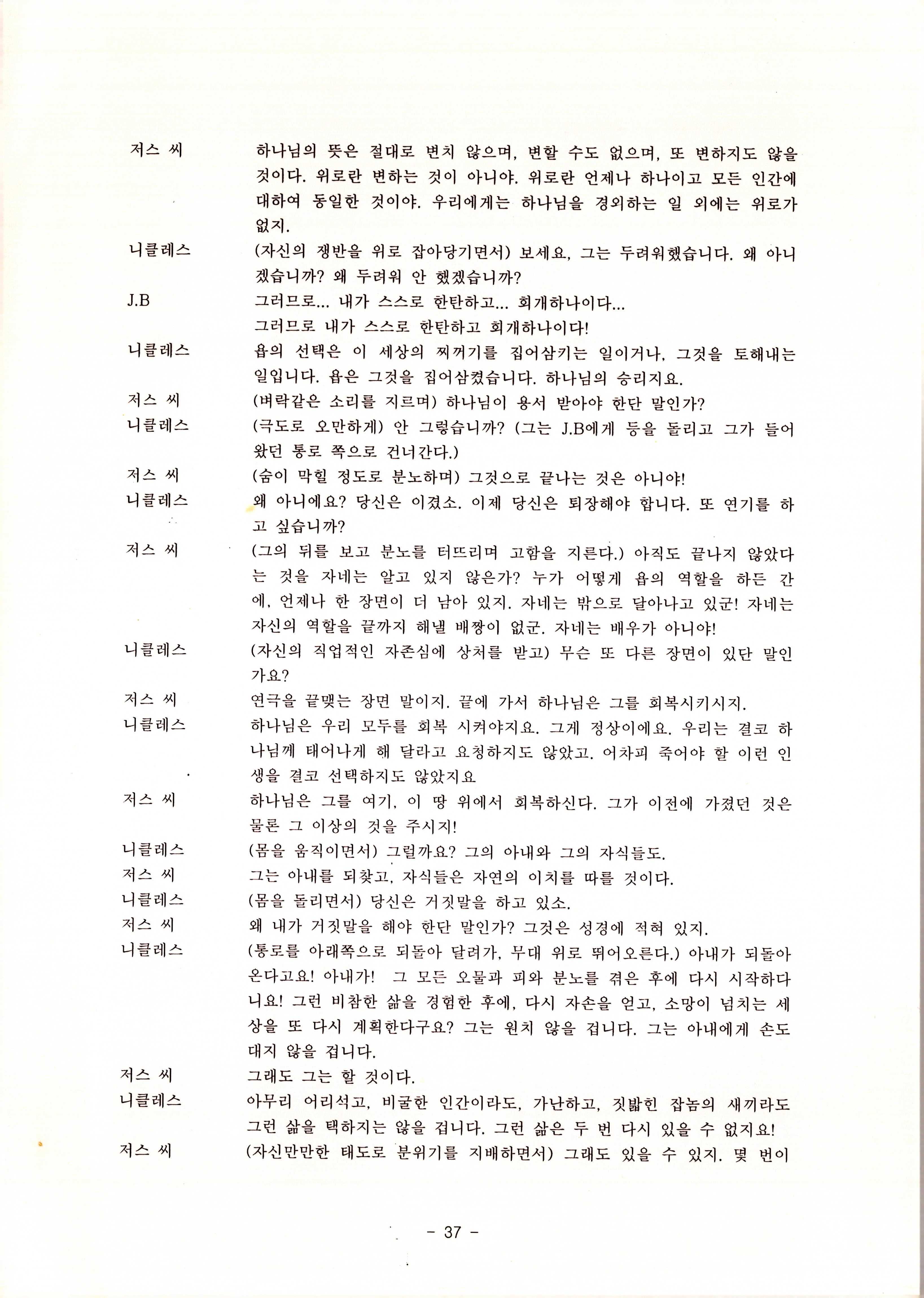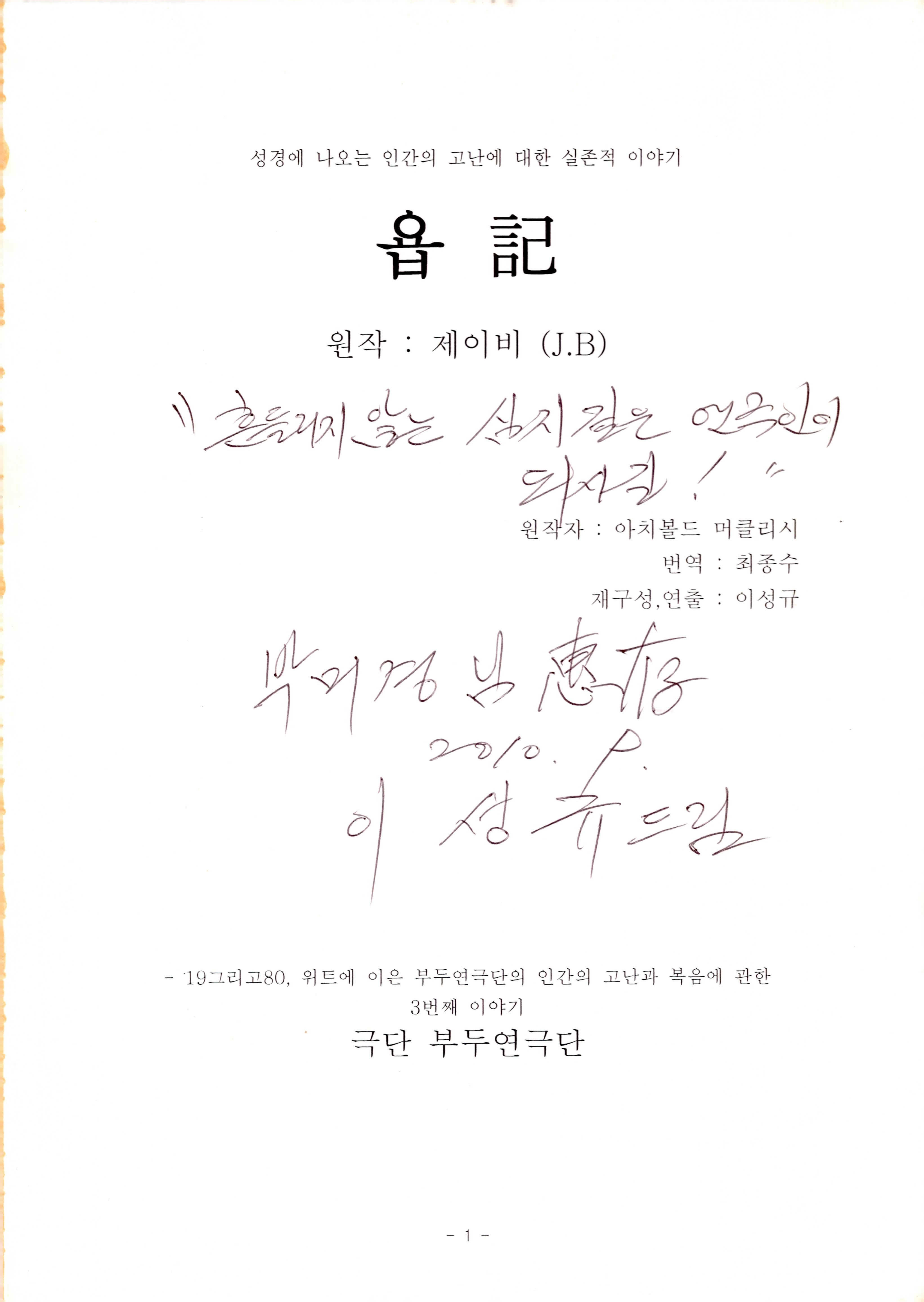 2010년 9월의 '욥記(원작: 제이비(J.B))' 대본집이다. 원작자 아치볼드 머클리시 연극으로 19그리고80, 위트에 이은 부두연극단의 인간의 고난과 복음에 관한 3번째 이야기 욥記 시나리오가 기술되어 있다.