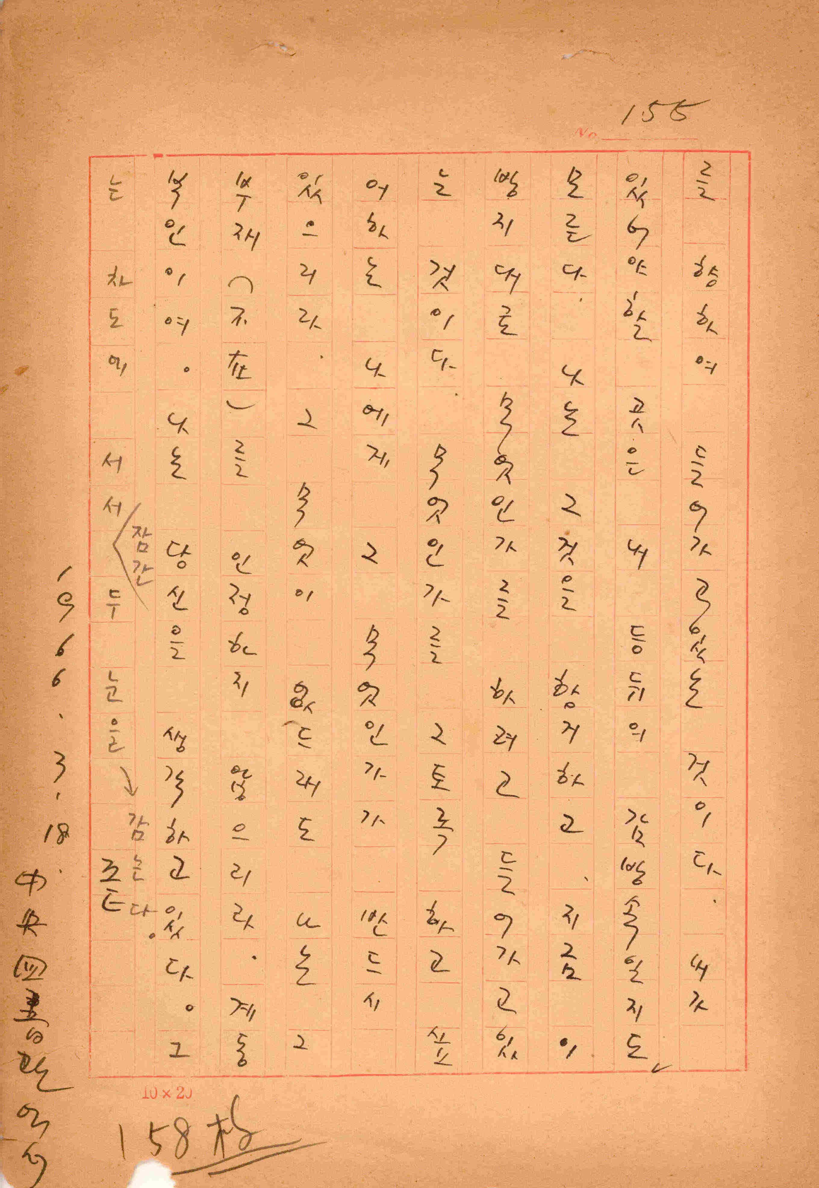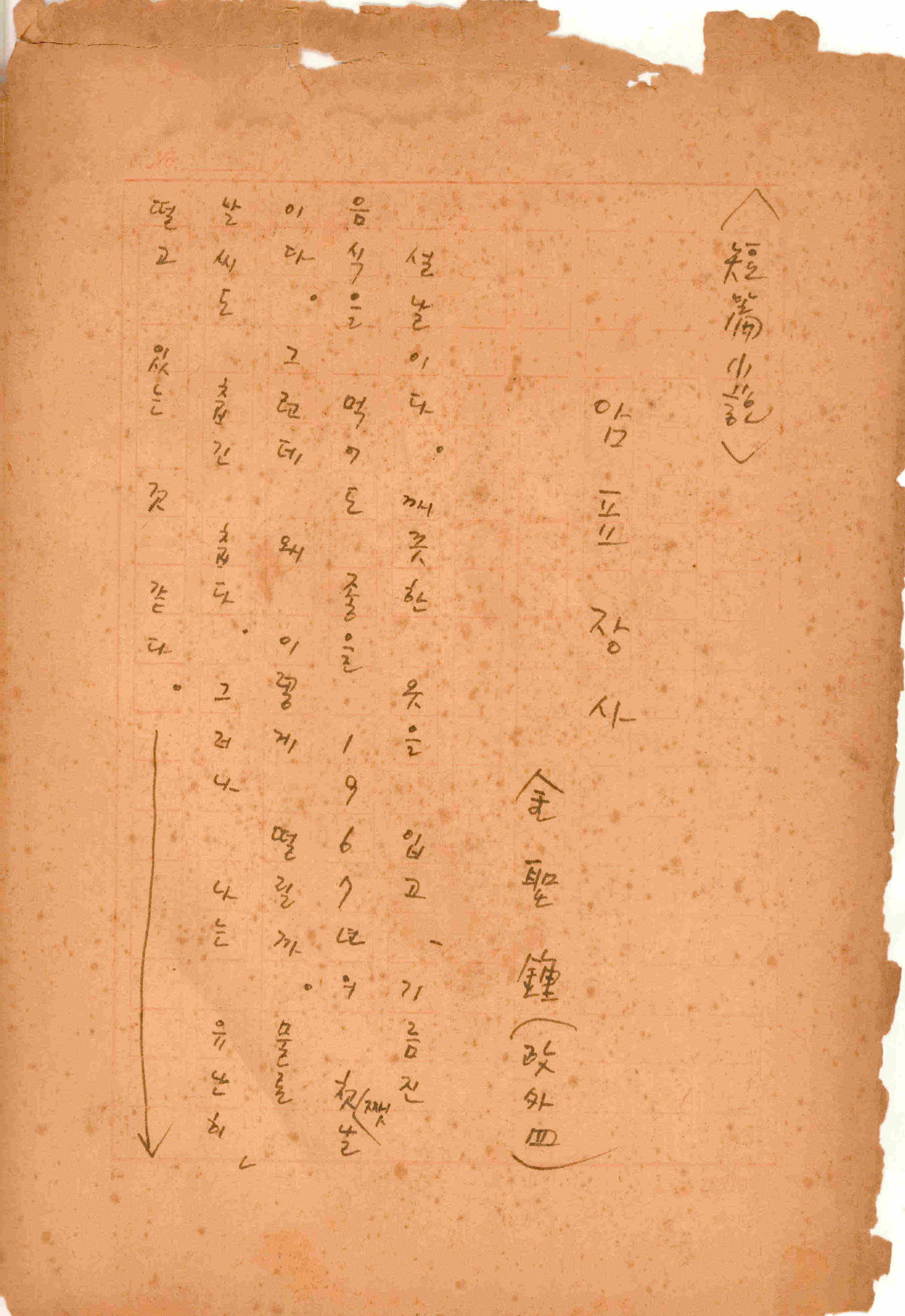 1966년 3월 18일에 집필 완료한 김성종의 미발표작 「암표장사」원고이다. 총 155장으로 구성된 단편소설이며 마지막 장에 '중앙사서관에서'(연세대학교 중앙도서관으로 추정)라는 수기로 작성한 메모가 있다.