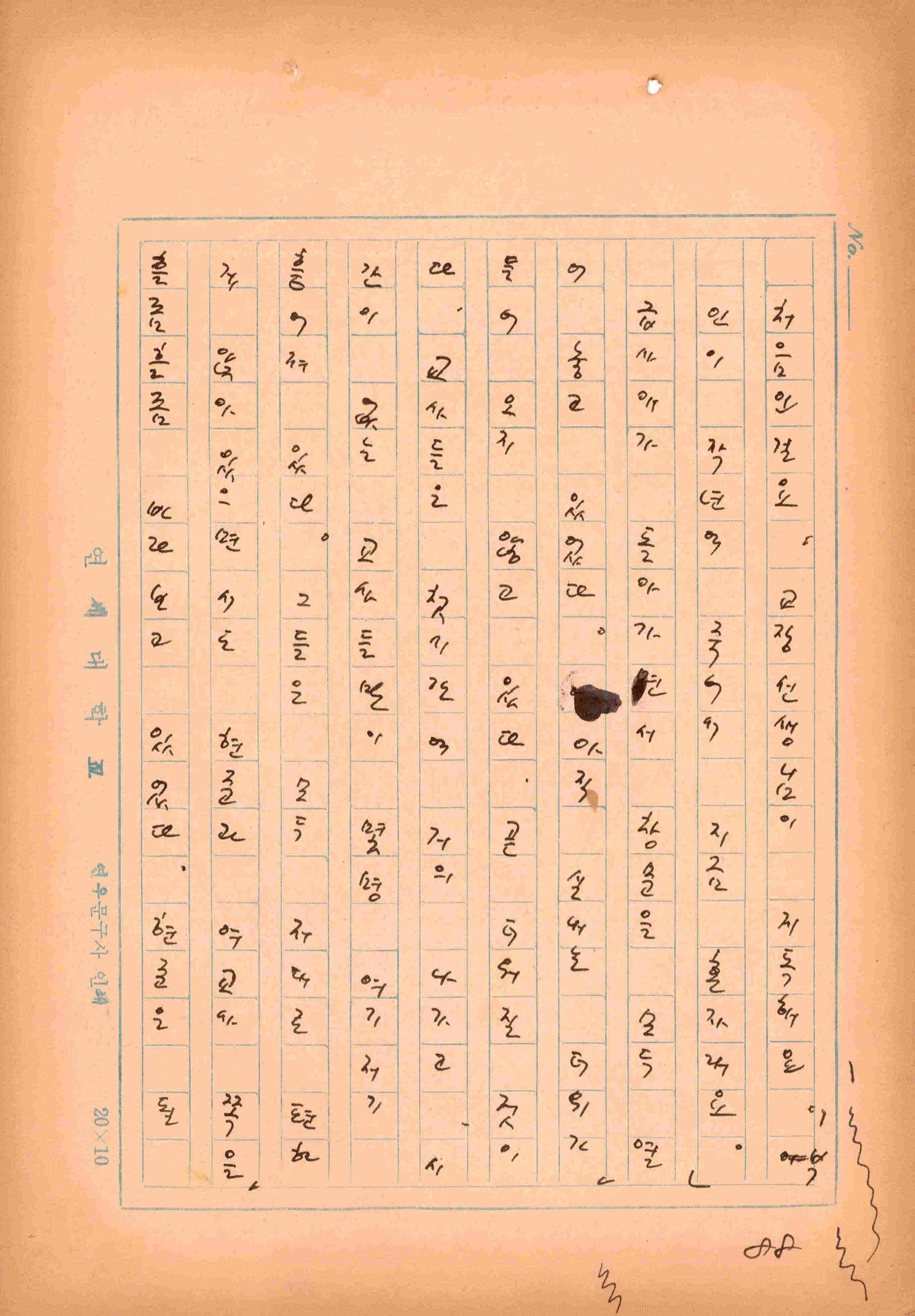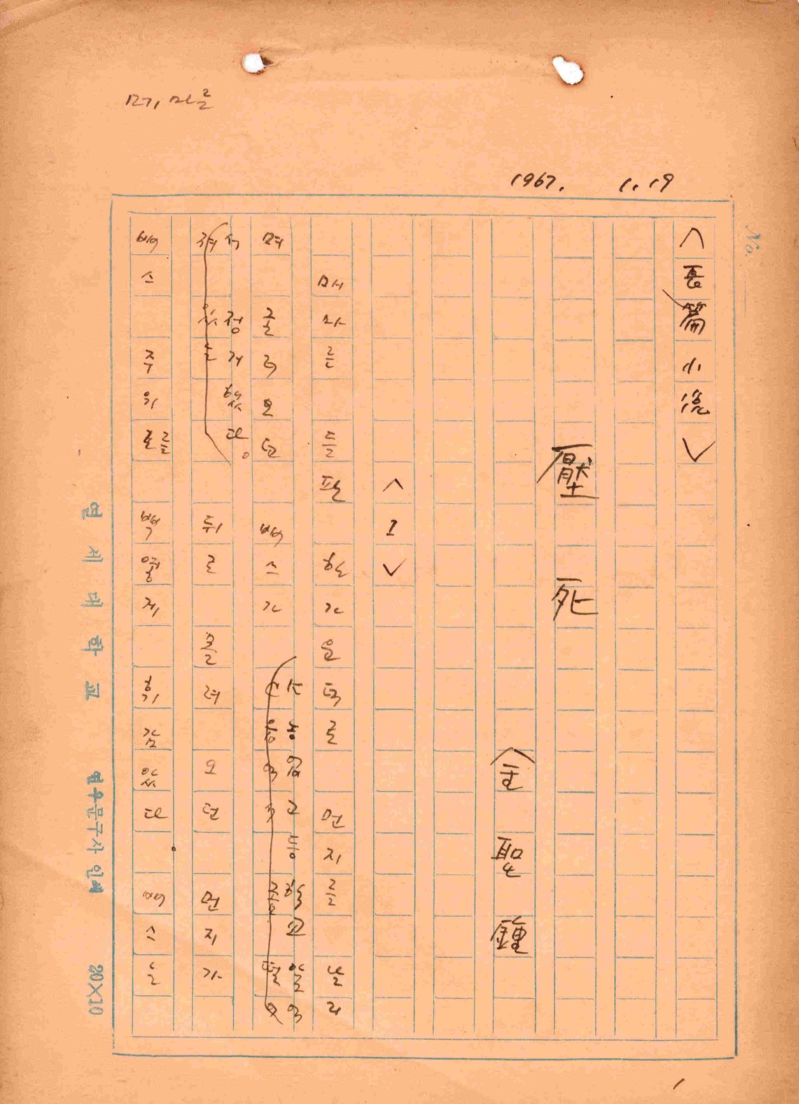 1967년 1월 19일에 집필한 김성종의 미발표작 「압사」 원고이다. 총 92장으로 구성된 장편소설이며 마지막 장 문장('…여고사의 머리는 지독히 까많다. 동양')을 보면 미완성작으로 추정된다. 마지막장 뒷면에는 '포푸리', '푸라타나스'등의 단어와 계산식이 수기로 적혀있다.
