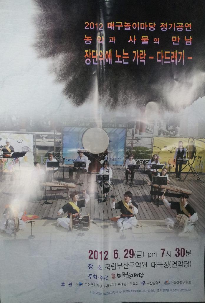 4. 풍물 판굿 : 판굿은 걸립패(동네의 경비를 목적으로 돈이나 곡식을 얻기 위하여 풍악을 연주했던 무리)와 남사당패(노래와 춤, 풍물 연주, 재주 등을 연행하던 집단)가 연행하던 음악과 놀이의 종합예술이다. 사물놀이 음악이 특히 귀를 통해 즐거움을 실어준 것이라면 판굿은 눈과 귀를 통해 무궁무진한 재미를 실어오는 순서다. 풍물 가락뿐만 아니라 춤과 기예, 놀이등이 골고루 섞어가며 각자 보여주고 들려줄 수 있는 최선의 재능을 보여주는 장인 것이다. 특히 이번 판굿은 부산농악(무형문화재 제6호)의 16마당을 재구성 하여 무대로 가져온 것이어서 더욱 볼거리가 색다르다 하겠다. 전반부에는 여러 가지 진법놀이를 벌리고 후반부에는 상솨놀이, 설장구놀이, 북놀이, 소고놀이와 같은 개인놀음이 펼쳐진다.