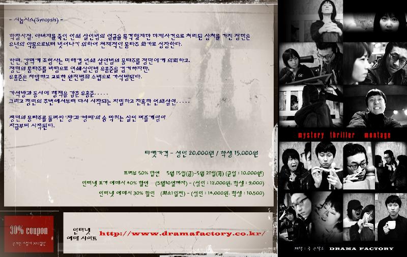 미스테리 스릴러극 <몽타주>는 한국추리문학 탄생 100주년을 기념하기 위해 제작된 창작극이다. 선악의 대결이라는 극적 긴장감, 의문투성이 사건과 그것을 추리해나가는 논리적 유희, 악의 인과로서 제시되는 등장인물들의 트라우마(유년의 정신적 외상), 역할과 기능이 뚜렷한 배우들의 앙상블.... 추리소설의 긴박감 넘치는 ‘재미’와 ‘의미’를 무대 위에 새롭게 재현하는 미스테리 스릴러극 <몽타주>는 이야기의 짜임새와 배우들의 열연이 돋보이는 웰메이드(Well-made) 장르 연극의 좋은 예가 될 것이다.