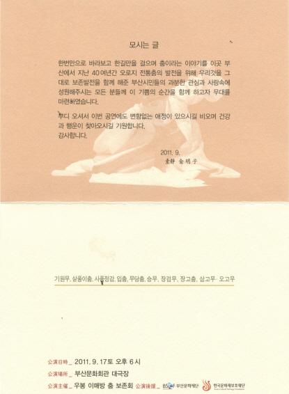 입춤은 호남 기방예술의 정통 계보를 잇는 춤으로 세련미와 애잔하고 요염한 여성적 교태미가 부각된 이매방 전통춤 특유의 미학과 맥을 지닌 춤이다.