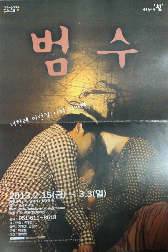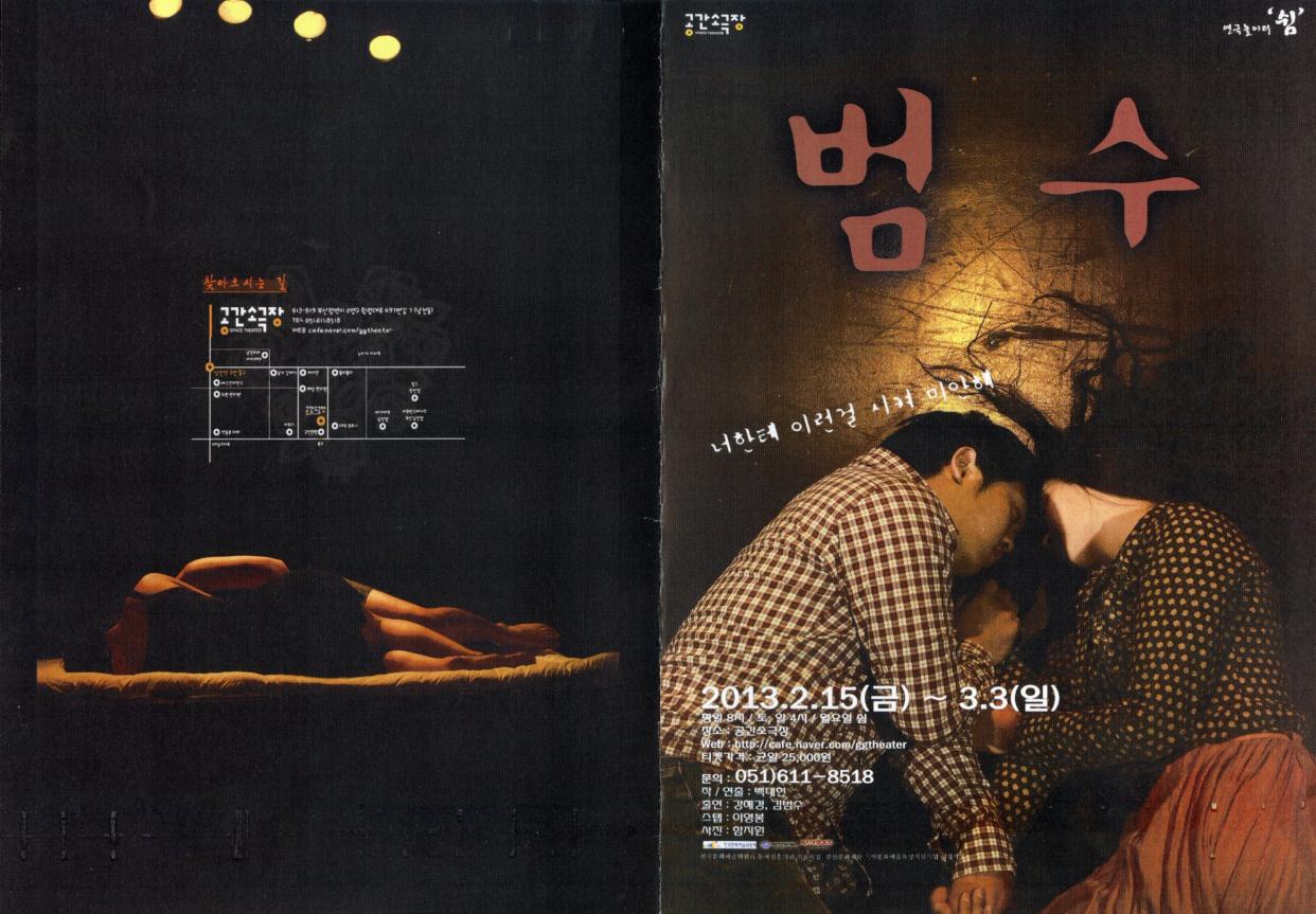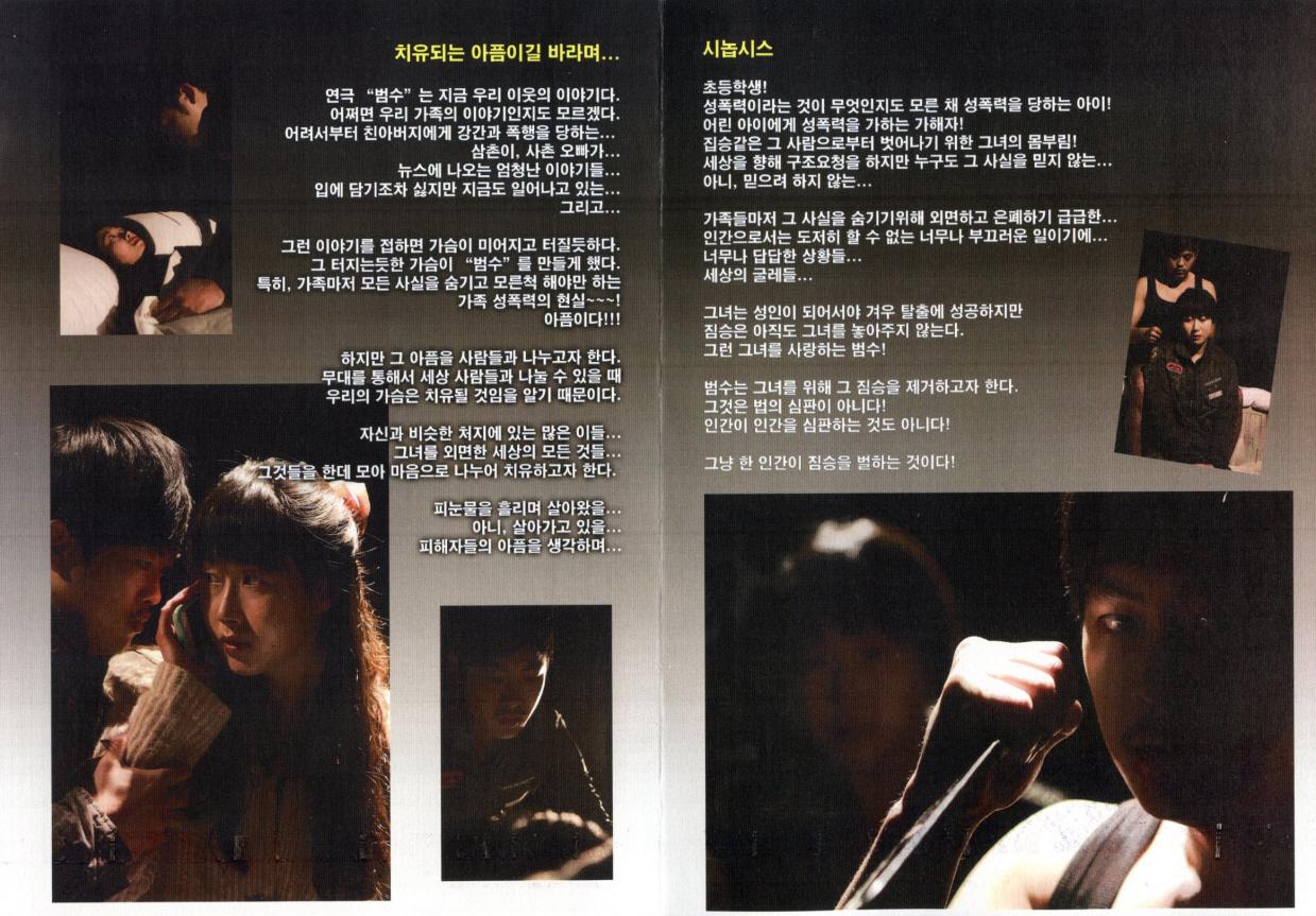 연극 "범수(犯手)"는 실화를 바탕으로 한다. 어려서부터 성인이 될 때까지 친아버지에게 강간과 폭행을 당하며 자란 여성 피해자가 쓴 자서전!그 자서전을 보며 가슴이 미어지고 터질듯한 느낌이 이번 작품 "범수(犯手)"를 만들게 했다. 가족마저 모든 사실을 숨기고 모른척 해야만 하는 현실! 아픔이다! 지만 그 아픔을 사람들과 나누고자 한다. 그 아픔을 치유할 수 있는 것은 무대를 통해서 세상사람들과 나눌수 있을 때 가능한 것임을 알기 때문이다. 자신과 비슷한 처지에 있는 많은 이들, 그녀를 외