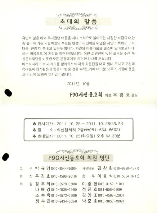 사진은 영상언어로서 촬영자의 느낌 그대로 사진으로 옮겨와 표현함으로써 그때 그 자리에서의 감동과 환희를 전시장에서 보는 모든 이와 함께 할 수 있게 표현한 것이 사진전시장이 아닌가 싶다. 우리 전시의 주 작품내용은 풍경사진을 모태로 하는 동호회로서 전국을 누비면서 자연의 아름다움을 렌즈에 담아내고자 어린시절 소풍 가기 전날 설레던 애뜻한 마음으로 사진 하나하나에 혼신의 힘을 다하여 촬영을 하였으며, 매번 계절이 바뀔때면 언제 어디로 몇명이 어떻게 사진을 찍을 것 인가를 월례회를 통하여 우리 나름 고민하고 연구하면서 전시장을 찾은 관람객들에게 최고의 사진작품과 흡족함을 주기 위해 최선의 노력을 기울여 전시회를 개최하게 되었다.