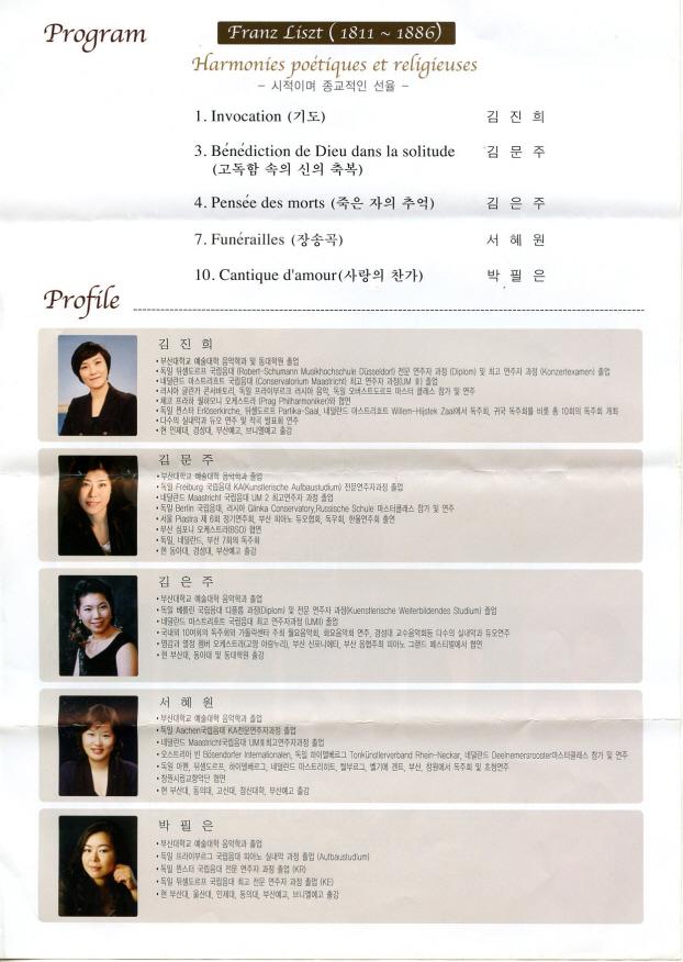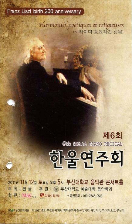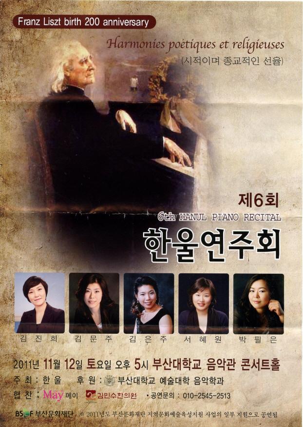 매년 지속적으로 하나의 타이틀을 선정하여 연주, 발표하는 한울의 제6회 정기연주회 타이틀은 2011년에도 그 맥락을 같이하며 <리스트 탄생200주년 기념음악회>이다. 프란츠 리스트의 탄생 200주년을 기념하여 리스트의 피아노 작품 중 주옥같은 피아노 레퍼토리중 부산지역에서 흔히 연주되지 않은 높은 난이도와 깊이 있는 철학적이고도 사색적인 리스트의 "시적이고 종교적인 선율 Harmonies Poetiques et Religieuses"을 선택해 연구하여 연주를 펼쳐낸다.