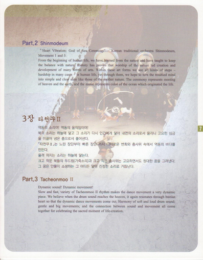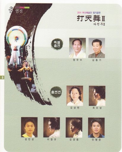 타천무 공연은 전통과 창작 가,무,악의 조화 속에서 시공간을 초원한 한의 풀이와 평안함을 기원하며 우리정서의 흥과 멋이 되살아나 여유의 미를 느낄 수 있도록 구성한 작품이다. 이번 공연은 총 세 막장으로 분류되었으며 제1장 [수신제.. 心의 전율]에서는 성주굿을 중심으로 만사형통이 되기를 기원하는 마음으로 구성되었고 제 2장 [꽃비로 개화일제..] 에서는 사물놀이를 위한 국악관현악 협주곡 신모듬 1장 3장으로 구성을 해보았다. 마지막 제 3장 [타천무II] 에서는 판굿, 진도북춤, 모둠북의 형태로 지난 2009년 볼 수 없었던 부산 아미한량 북춤과 관객과 하나가 될 수 있는 공연을 그려내어 보았다. 이번 공연을 통해 2011년 해가 지기 전에 모든 고충들을 굿판에 담아 던져버릴 수 있는 모두의 판이 될 수 있기를 바래본다.
