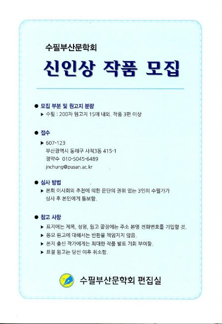 1963년 문학의 불모지라 일컬어지던 우리 부산에 당시 선구자이던 김일두, 김병규, 박문하, 정신득, 장성만, 허천, 오도한 등 제시가 부산문화 발흥을 기치아래 힘을 모아 창간호를 낸 이후 반세기를 이어오면서 문운의 향상을 기함은 물론 문화 저변확대에 일로 매진하며 오늘에 이르렀다. 2년전에는 유감스럽게도 진흥기금 대상 탈락이란 청천벽력같은 소식을 접하자 흥미와 좌절에 빠지곤 하였으나, 주변의 위로와 편달로 더욱 강한 의혹을 보이며 76호를 내보내었다. 부산에 이어 한국 문예사에서도 비견될 문예지가 없을 정도로 장구한 세월동안 전통을 보존하며 새 문화를 확산하는 일에 혼신의 힘을 다했다고 자부한다. 앞으로도 우리 회원들의 온 정성을 쏟아 새 문화 창조의 역할을 다 할것임을 다짐한다.
