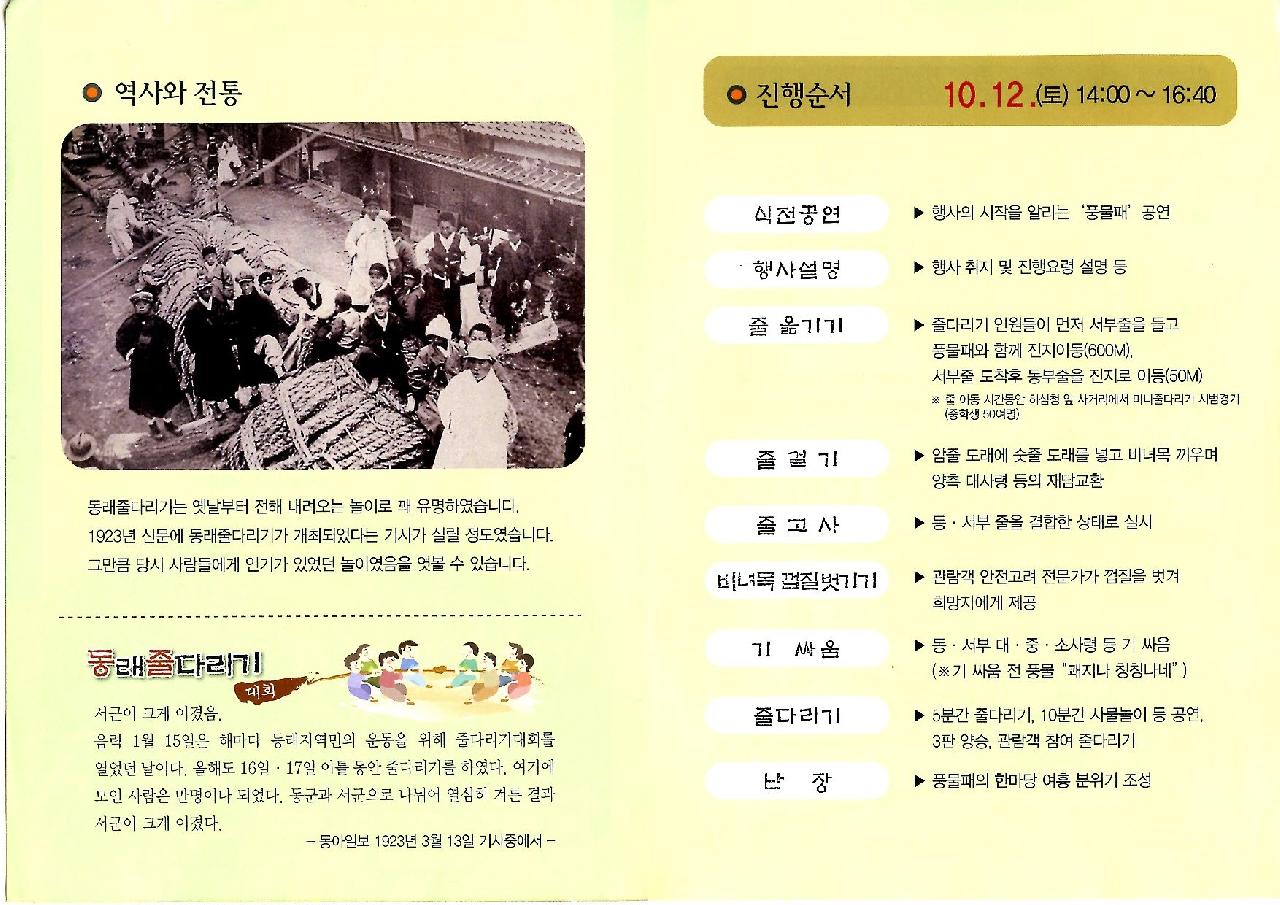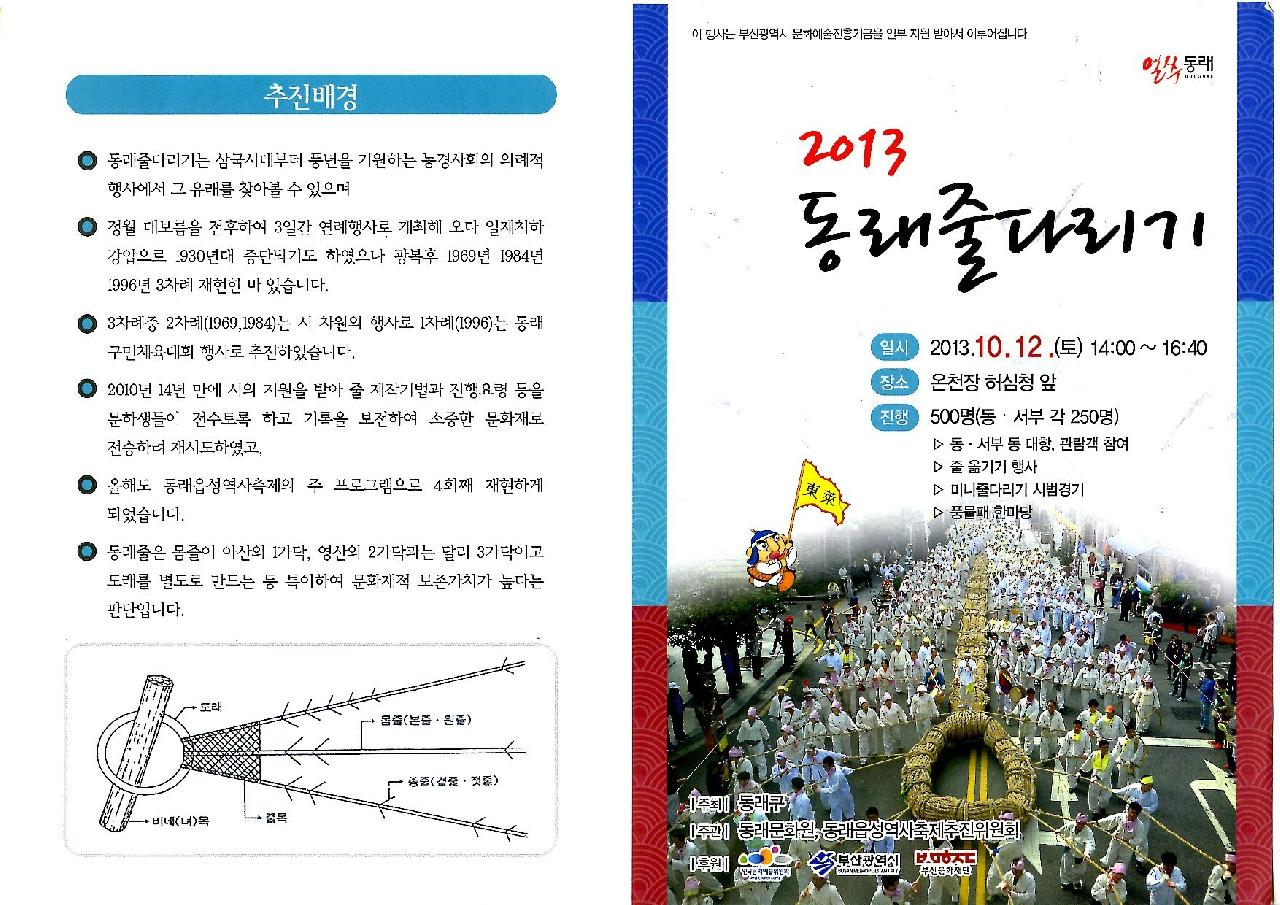 동래줄다리기는 동래지역 문화(동래야류, 동래학춤, 동래지신밟기 등)의 중심에 있었던 축제임에도 도시화 과정 속에서 새끼줄의 공급문제 및 재정의 문제등으로 인해 그 맥이 끊어질 현실이다. 급변하는 현대 문명사회에서 전통예능이 나날이 인멸되고 있는 현시점에서 보다 깊은 고증을 통하여 원형을 찾아 복원하여 길이 전승 보존할 필요가 절실하다. 부산 동래에는 줄의 제작이나 놀이의 진행 등에 대한 기술예능 보유자가 한 분 (김영수) 밖에 없을 뿐더러, 그분들이 타계하기 전에 올바르게 복원해야 한다. 다행스럽게도 2010년 동래구 동래읍성역사축제의 일환으로 동래줄다리기 재현이 진행되었다. 동래줄다리기의 전체적인 과정을 연구하고, 고증을 통한 제작 및 재현을 실현하고자 한다. 줄 행사 뿐만 아니라 소리, 풍물, 깃발싸움 등 종합적인 동래줄다리기를 재현하고자 한다. 동래줄은 본줄(몸줄, 원줄)이 3가닥이라는 특색을 가진다. 영산(靈山)줄다리기(중요무형문화재 26호)나 기지시(機池市)줄다리기(중요무형문화재 75호)가 한 두 가닥인 데 비하면 규모가 커서 많은 사람이 당길 수 있는 것이다. 큰줄이 되기까지에는 지방의 어린이들의 참여가 있었기 때문이다. 줄꾼은 어떤 제한이 없고 남녀노소 누구나 다 참여할 수 있다. 줄땡기기는 교감주술적(交感呪術的) 행위로서 풍작을 기원하는 의미를 가지며, 줄꾼은 어떤 제한이 없고 남녀노소 누구나 참여할 수 있다. 기원적 의미를 가진 전통적인 대동놀이이다. 동래줄다리기를 올바르게 복원, 재현하여 부산을 대표하는 범시민적인 전통민속놀이로, 부산의 중요한 축제로 자리잡도록 해야 할 것이다.
