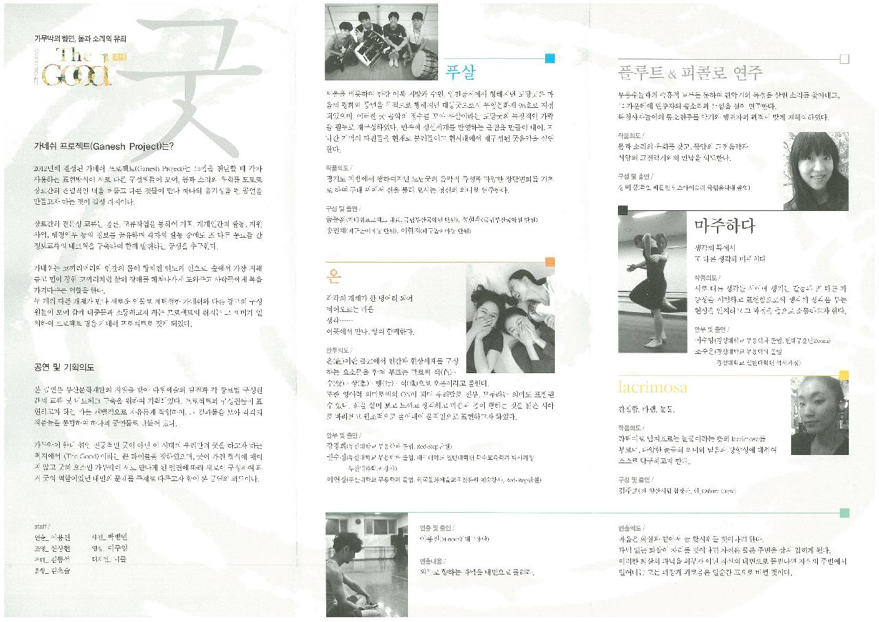 생명의 조화, 유기적 관계, 이 모든 것은 해체되었던 것들이 다시금 하나가 되는 과정을 무수히 겪어오며 같은 구성물질로서 매번 다른 결과물을 만들어 내고 있다. 우리의 굿은 이러한 부분을 정신적 해체와 집단 카타르시스를 느끼게 함으로서 간접적이나마 근원에 다가서게 하고자 한다. 오늘날에 이르러 우리의 굿은 전통의 문화가 되었다. 이 시대는 이 시대에 맞는 굿이 필요하다. 집요하게 해체하고 집요하게 결성하는 오늘을 살아가는 오늘의 정신에게 우리의 굿은 Good으로 다가온다. 연산적 봉합구조의 형태는 해체와 맏닿아 있다. 은 작업을 하는 모든 이가 봉합구조로 연결되어 새로운 하나를 보여줄 것이다. 이에 관람하는 이들 모두 푸리가 되기를 기원해본다.