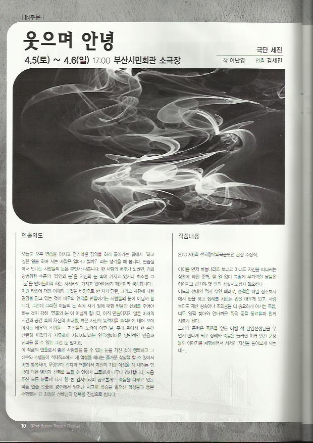 - 지역의 대표 연극예술제인 부산 연극제 경연 참가작이며, 2013 전국 창작 희곡 공모 당선작을 무대에 선보입니다. 창작 희곡 극작과 그것을 창작극으로 극화하여 시민의 문화향수의 기회를 넓히는 선순환적 문화 구성에 기여하며 더 나은 창작공연으로 보다 많은 부산 관객층의 호응과 문화예술 참여의 장을 열고자 합니다. 획일적이고 자극적이며 중앙 중심 문화의 홍수 속에서 살고 있는 부산 관객들에게 전 연령층이 함께 즐기고 감상할 수 있는 부산의 문화 컨텐츠를 만들려 합니다.