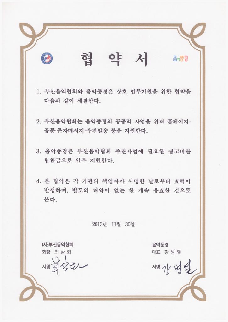 음악풍경 창립 및 부산음협과의 협약서